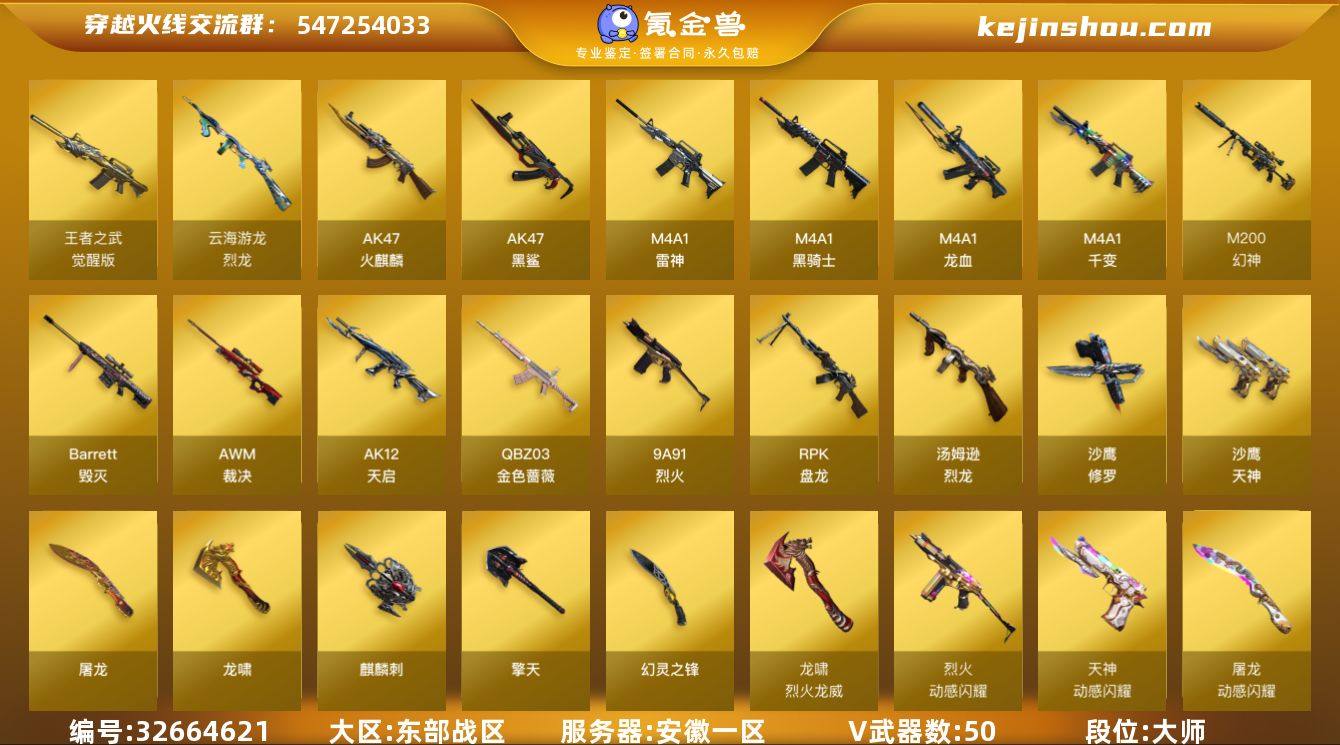 【940265】安徽一区-52V-1王者武器数-0炫金武器数 【热门武器】:QBZ03-金色蔷薇,M200-幻神,M4A1-黑骑士,汤姆逊-烈龙*6,RPK-盘龙,沙鹰-修罗,Knife-冠军之刃 【音效卡】:天神-动感闪耀 音效卡,M4A1-黑骑士音效卡,Barrett-毁灭音效卡 【皮肤】:幻神-冠军之幻,M200-幻神-荣耀世冠白鲨,幻神-动感闪耀 皮肤,雷神-星空,雷神-R.LGD-CFPLS18冠军,雷神-维纳斯皮肤,雷神-动感闪耀 皮肤,火麒麟-心动糖果,毁灭-星空,毁灭-冠军之怒,M4A1-千变-孔明皮肤,黑骑士-AG-S4冠军典藏,龙啸-冠军之啸 【角色】:魅影,乔伊教练,云海玲珑,空,暗夜-X,风暴女,嘉年华灵狐,兰妹妹,猎狐者-追月,零-水下丽影,灵狐-花神,灵狐者-X,潘多拉-X,青霞仙子,斯沃特-X,铁骑荣耀,维纳斯,新娜塔莎,雪莉杨,团团 【人偶武器】:AWM-灵狐-15周年嘉年华,COP-旗袍,迷你牛魔王 【暴走生化】:超级对讲机 【挑战大师】:AK47-冰龙粉碎者,激光毁灭者III 【英雄级武器】:M4A1-千变,AK47-火麒麟*2,M4A1-雷神,M4A1-黑骑士,AK12-天启*3,AK47-黑鲨,M4A1-龙血,QBZ03-金色蔷薇,9A91-烈火,烈火-动感闪耀,王者之武-觉醒版,Barrett-毁灭,AWM-裁决,M200-幻神,RPK-盘龙,汤姆逊-烈...
