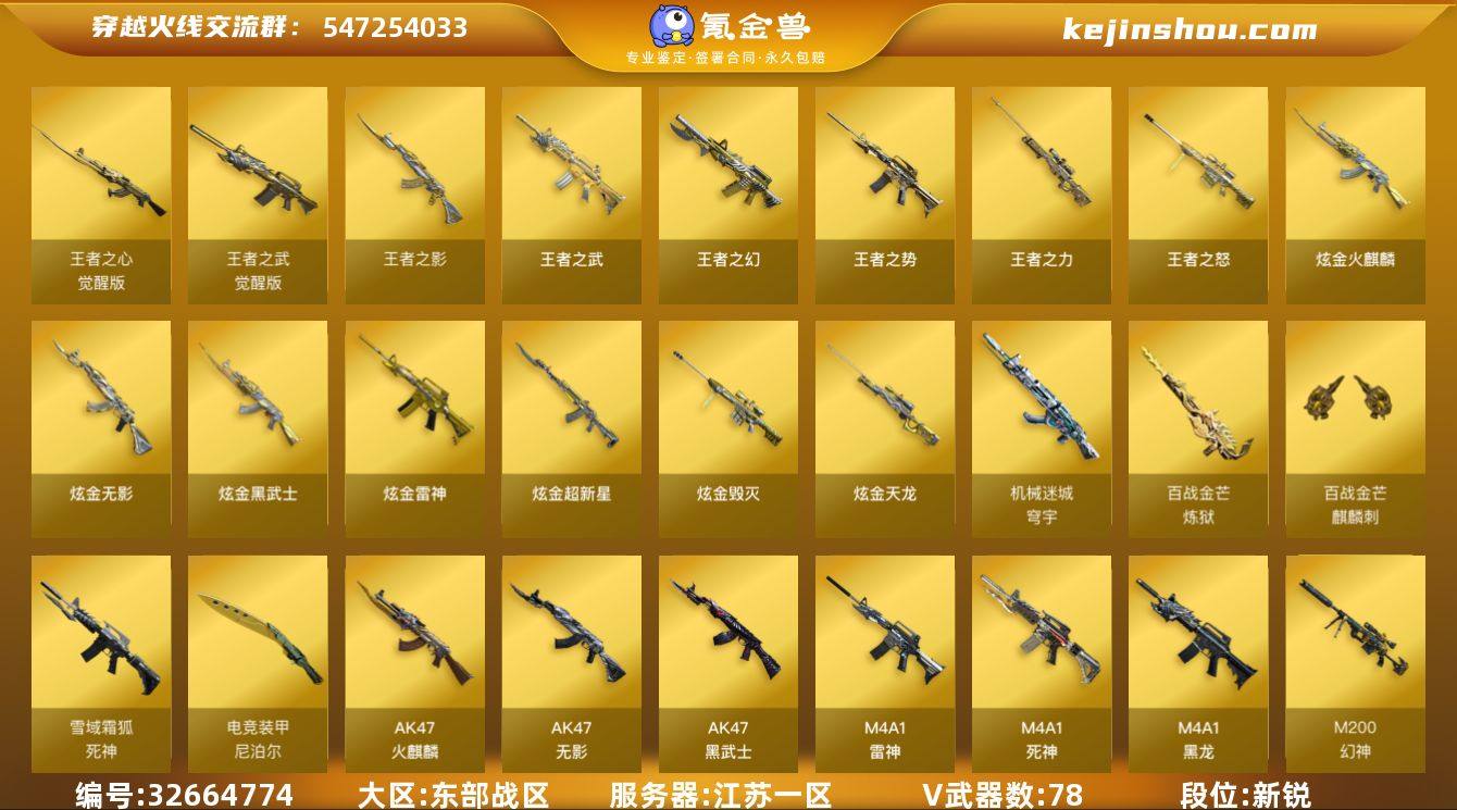 江苏一区-86V-13王者武器数-9炫金武器数 【热门武器】:QBZ03-金色蔷薇,Scar Light-白虎,M200-幻神,死亡之眼,汤姆逊-烈龙*5,加特林-炼狱*3,斯泰尔-蝴蝶,沙鹰-修罗*2 【王者炫金武器】:王者之幻*2,王者之势,王者之武,王者之影*2,王者之怒,王者之力*4,炫金火麒麟*2,炫金无影,炫金雷神,炫金武士*2,炫金超新星,炫金毁灭,炫金天龙 【音效卡】:AK47-火麒麟音效卡,M4A1-雷神音效卡,Barrett-毁灭音效卡,Barrett-碧霄极光音效卡,炼狱-百战金芒-庆典舞曲音效卡,死神-雪域霜狐-怀旧音效卡 【皮肤】:幻神-动感闪耀 皮肤,烈龙-星空*2,雷神-星空,雷神-虎将,雷神-宠儿-2019MVP,M4A1-再燃火线,火麒麟-雷神,火麒麟-华夏之心,火麒麟-平天大圣,火麒麟-百城,火麒麟-心动糖果,毁灭-荣耀之怒,毁灭-星空*2,毁灭-冠军之怒*2,毁灭-BEAN-2020MVP,毁灭-英雄计划 皮肤,黑龙-能量核心,M4A1-黑龙-361,无影-能量核心,AK47-黑武士-361*3,天龙-秘银,AWM-天龙-传奇白鲨,屠龙-荣耀之锋,轻型军用手斧-再燃火线 【角色】:葵,瞳,零·纪元,战地猎狐,王者-零,王者-魅影,雪域霜狐,葵-阿尔法武装,幻面灵狐,空,北极狐-X,娟娟,曼陀罗-X,潘多拉-X,潘多拉-...