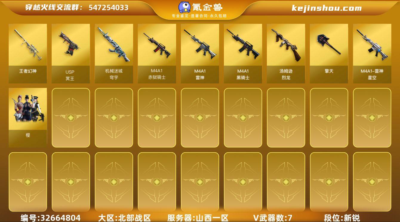 山西一区-11V-1王者武器数-0炫金武器数 【热门武器】:王者幻神,M4A1-黑骑士,汤姆逊-烈龙 【王者炫金武器】:王者幻神 【音效卡】:M4A1-苍鸣雷神音效卡 【皮肤】:雷神-星空 【角色】:樱,奇洋探员,幻面灵狐,暗夜-X,疾风,灵狐者-X,灵狐者-黄金海岸,潘多拉-甜心教官,青霞仙子,铁骑荣耀,影武者-X,智影 【英雄级武器】:M4A1-雷神,M4A1-黑骑士,机械迷城-穹宇,汤姆逊-烈龙,USP-冥王,擎天,屠龙-电竞之星,M4A1-赤狱骑士,AK47-竞魂无影 【源级武器】:源-千变,源·火麒麟*2,源-黑龙,源·雷神*3,魂·雷神-诺拉,魂·雷神-神秘按键,魂·雷神-新春神龙,源·黑骑士,魂·黑骑士-现代金属,灵·黑骑士-破界 I*2,源·天启,源·超新星,源·武圣*2,源·机械迷城,魂·龙血-锋芒破茧,M4A1-青龙-掌上穿越火线,魂·HK417-朱雀-凤灵*2,源-金色蔷薇,金色蔷薇-狼王,QBZ03-文殊坊,魂·9A91·烈火-电子连击*2,魂·玫瑰精灵-傲梅,源·玫瑰精灵,魂·英雄-湾区光枢,Barrett-极光-掌火,源·天龙*2,魂·天龙-彼岸花,魂·裁决-凤灵,魂·裁决-羽掣,源·毁灭*2,魂·毁灭-神秘黑洞,御·毁灭-黑大圣,魂·Barrett-朱雀-锦鲤,灵·Barrett-朱雀-炫光*2,魂·炼狱-玩具枪*2,魂·炼狱-蒸汽钟表...