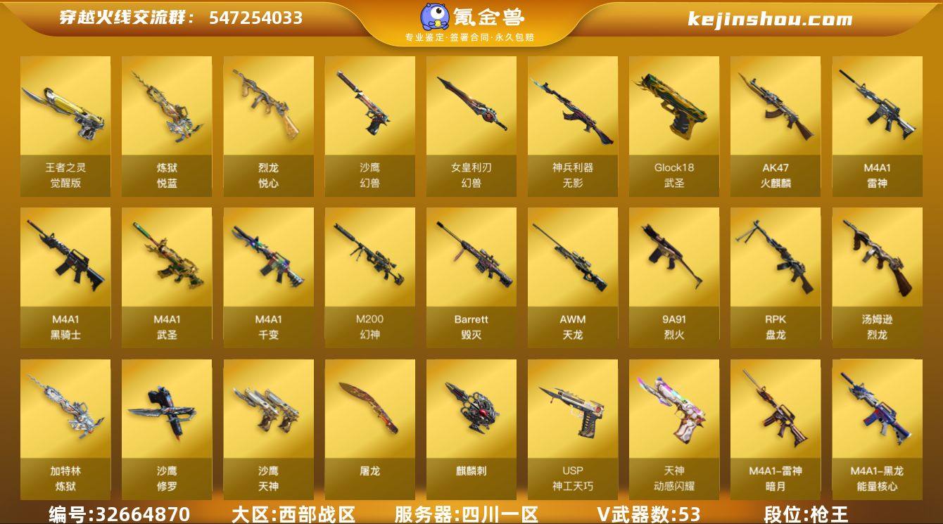四川一区-57V-4王者武器数-0炫金武器数 【热门武器】:M200-幻神,M4A1-黑骑士,汤姆逊-烈龙*6,RPK-盘龙*2,加特林-炼狱*2,沙鹰-修罗,金刚伞,高爆手雷-幻兽*2 【王者炫金武器】:炼狱-悦蓝,烈龙-悦心 【音效卡】:M4A1-黑骑士音效卡 【皮肤】:白虎-大汉风骨,雷神-暗月,火麒麟-心动糖果,毁灭-英雄计划 皮肤,黑龙-能量核心,无影-暗月,天启-暗月*2,烈火-动感闪耀 皮肤,战神-紫绶金章皮肤,极光-能量核心,屠龙-星火燎原 【角色】:零,葵,雪域霜狐,乔伊教练,云海玲珑,北极狐-X,风暴女*2,嘉年华灵狐,兰-新年限定,零-水下丽影,龙儿,曼陀罗-礼服,青霞仙子,斯沃特-X,兔囡囡,铁扇公主-暗灵,影武者-X 【人偶武器】:AWM-灵狐-15周年嘉年华,COP-旗袍,迷你牛魔王,迷你艾比 【暴走生化】:超级对讲机 【英雄级武器】:M4A1-千变,AK47-火麒麟*2,M4A1-雷神,M4A1-黑骑士,M4A1-武圣,QBZ03-天罚,无影-神兵利器,9A91-烈火*2,超新星-悦享-觉醒版,AWM-天龙,Barrett-毁灭,M200-幻神,RPK-盘龙*2,加特林-炼狱*2,汤姆逊-烈龙*6,沙鹰-修罗,沙鹰-天神*3,沙鹰-幻兽*2,USP-神工天巧,王者之灵-觉醒版,Glock18-武圣,天神-动感闪耀,屠龙*3,麒麟刺,女...