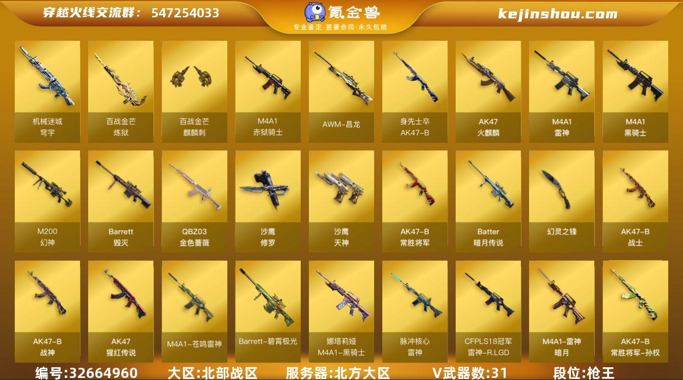 北方大区-36V-4王者武器数-0炫金武器数 【热门武器】:QBZ03-金色蔷薇,M200-幻神,M4A1-黑骑士,毁灭-孙三炮,沙鹰-修罗 【王者炫金武器】:高爆手雷-雷霆王者 【音效卡】:M4A1-黑骑士音效卡,沙鹰-修罗-盛典舞曲音效卡*2,Barrett-碧霄极光音效卡*2,炼狱-百战金芒-庆典舞曲音效卡,AWM-昌龙-怀旧音效卡 【皮肤】:M200-幻神-荣耀世冠白鲨,QBZ03-荣耀世冠EP 皮肤,裁决-流光秘银,雷神-暗月,雷神-R.LGD-CFPLS18冠军,雷神-脉冲核心,M4A1-再燃火线,毁灭-SV-CFPLS16冠军,毁灭-黑大圣皮肤,毁灭-秦师 皮肤,毁灭-英雄计划 皮肤,M4A1-黑骑士-娜塔莉娅 皮肤,战神-粉色甜心皮肤*2,战神-紫绶金章皮肤*2,AK47-B-常胜将军-刘备*2,AK47-B-常胜将军-孙权*2,轻型军用手斧-再燃火线 【角色】:妮妮,零·纪元,战地猎狐,王者-葵-貂蝉,王者影豹,奇洋探员,乔伊教练,云海玲珑,葵-阿尔法武装,幻面灵狐,暗夜-X,初恋灵狐,芳心审判者,飞虎队-X,风暴女,嘉年华灵狐,猎狐者-追月,灵狐者-X,灵狐者-黄金海岸,灵狐者-七夕宝贝,曼陀罗-礼服,潘多拉-X,潘多拉-甜心教官,蛇姬,斯沃特-X,王者-零-传说之路,雪莉杨-摸金校尉,樱-战斗天使,游珑儿,潘多拉-N,团团 【人偶...