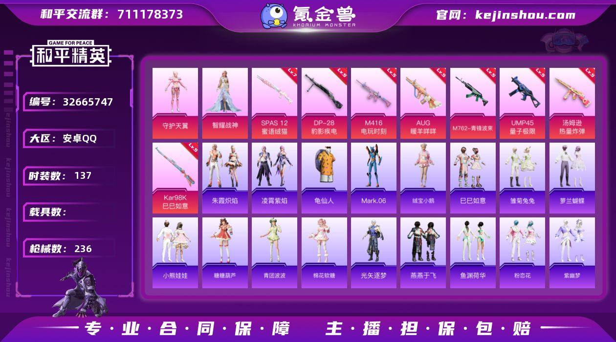 【kyhp1229】安卓 手Q-2粉装-10特效枪-0载具-2粉色飞行器-60751热力值-10王牌印记-137套装-236枪皮 【热门品类】:套装-龟仙人,角色-Mark.06 【粉色套装】:角色-守护天翼,角色-智耀战神 【粉色枪皮等级】:M416-电玩时刻(五级),AUG-暖羊咩咩(五级),M762-青锋波束(五级),UMP45-量子极限(五级),汤姆逊-热量炸弹(五级),Kar98K-巳巳如意(五级),Mk14-福马献瑞(五级),AA12-G-萌骑幻想(二级),SPAS-12-蜜语绒猫(七级),DP-28-豹影疾电(五级) 【粉色枪皮】:M416-电玩时刻,AUG-暖羊咩咩,M762-青锋波束,UMP45-量子极限,汤姆逊-热量炸弹,Kar98K-巳巳如意,Mk14-福马献瑞,AA12-G-萌骑幻想,SPAS-12-蜜语绒猫,DP-28-豹影疾电 【粉色飞行器】:炫彩糖果飞行器,极意拳锋飞行器 【粉色降落伞】:第五大道降落伞,未来歌姬降落伞,绝色倾城降落伞,桃粉嫣然降落伞,绯穹魔姬降落伞,炫彩糖果降落伞 【稀有套装】:套装-龟仙人,套装-绒宝小鹅,套装-巳巳如意,套装-炫彩糖果,套装-马上来财,套装-雏菊兔兔,套装-萝兰蝴蝶,套装-小熊娃娃,套装-糖糖葫芦,套装-青团波波,套装-棉花软糖,角色-光矢逐梦,套装-燕燕于飞,套装-鱼渊荷华,套装-粉恋花,套装-紫幽梦,套装-蓝...