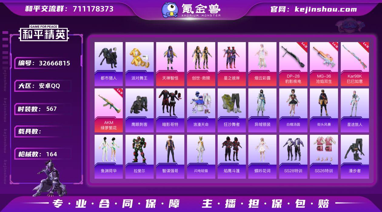 【特价出售】安卓Q-4稀有4粉装6特效枪9热门130套装163枪皮 43161热力值 7印记 历史卓越王牌12星 【4稀有】 都市猎人 浪漫天命 派对舞王 派对舞王(金靴子) 【4粉装】 烟云彩露 创世救赎 天禅智恒 星之彼岸 【6特效枪】 AKM-绿萝繁花 (5级) Kar98K-巳巳如意 (5级) MG-36-沧焰双生 (5级) DP-28-豹影疾电 (5级) Mk14-福马献瑞 (5级) UMP45-萌骑冒险 (4级) 【9热门】 Mark.06 龟仙人 鹰眼刺客 暗影哥特 水银刺客 狂沙舞者 漫步者 破蛋小黄鸡 极速红龙