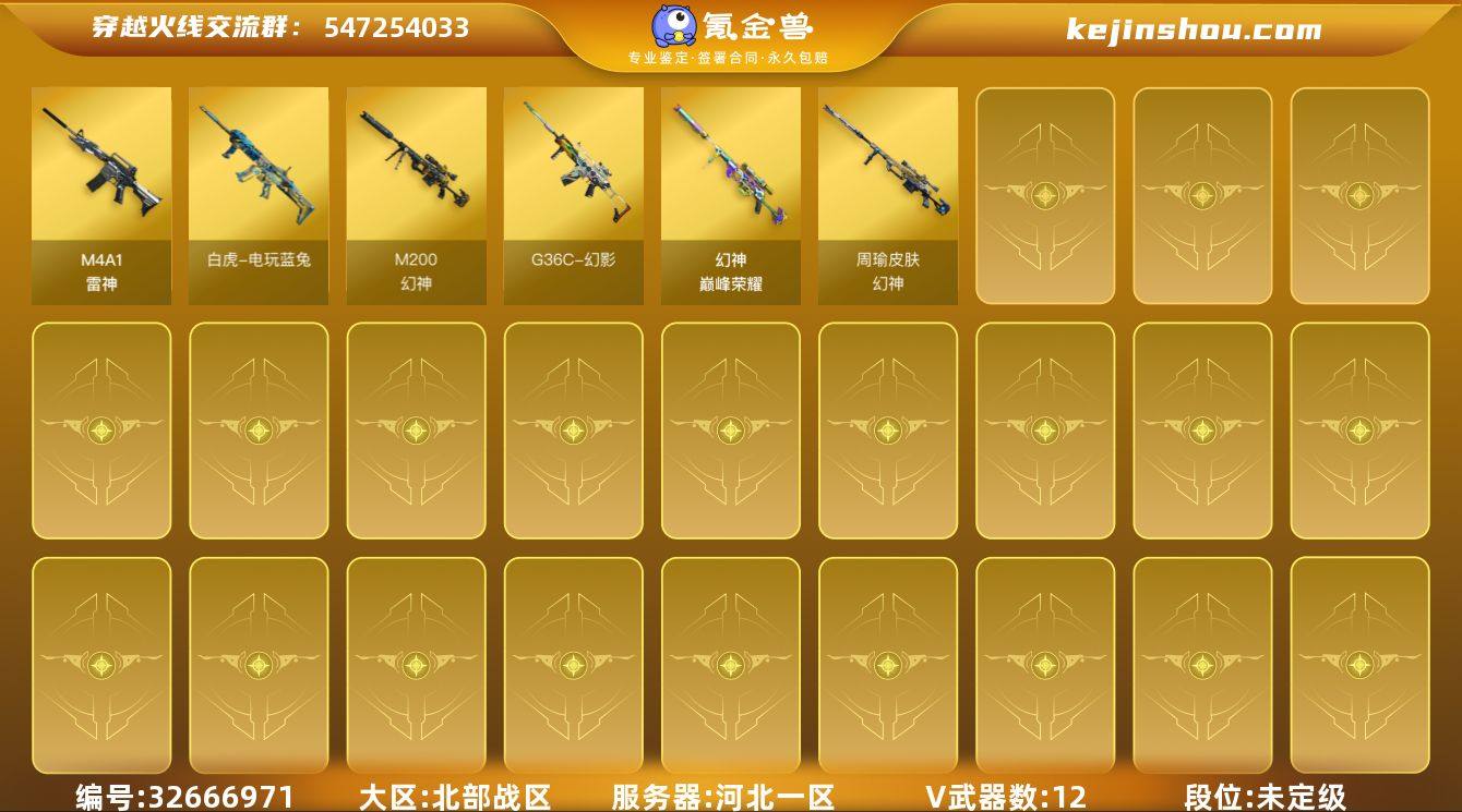 河北一区-15V-2王者武器数-0炫金武器数 【热门武器】:G36C-幻影,M200-幻神,白虎-电玩蓝兔 【王者炫金武器】:AK47-雷暴王者 【皮肤】:幻神-周瑜皮肤,幻神-巅峰荣耀,M4A1-再燃火线,轻型军用手斧-再燃火线 【角色】:鹰,零·纪元,乔伊教练,葵-阿尔法武装,幻面灵狐,初恋灵狐,风暴女,娟娟,斯沃特-X,潘多拉-N,团团 【人偶武器】:生化手雷-机甲核心 【英雄级武器】:M4A1-雷神,G36C-幻影,白虎-电玩蓝兔,HK417-朱雀-电竞之星,机械迷城-穹宇,M200-幻神,麒麟刺-百战金芒,屠龙-电竞之星,闪光弹-雷暴王者,M4A1-苍鸣雷神,AK47-竞魂无影,Barrett-碧霄极光 【源级武器】:御·火麒麟-平天大圣,源·雷神,魂·M4A1-雷神-化蛇,魂·雷神-诺拉,魂·雷神-神秘按键,魂·雷神-新春神龙,魂·雷神-15周年嘉年华,灵·黑骑士-炫光,源·机械迷城,源·青龙,灵·HK417-朱雀-甜蜜火力,源-金色蔷薇,金色蔷薇-狼王,魂·英雄-湾区光枢,源·天龙,魂·裁决-凤灵,魂·裁决-新人王绿豆,魂·毁灭-神秘黑洞,魂·炼狱-月,魂·修罗-15周年嘉年华,魂·修罗-迷彩,魂·修罗-现代金属*2,灵·天神-穹宇,魂·屠龙-惊鸿,源·擎天-萌杀,魂·龙啸-秦师,魂·龙啸-玩具枪*2,灵·麒麟刺-穹宇 【道具】...