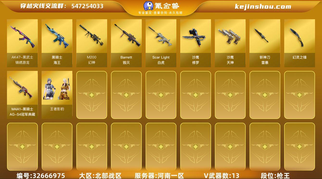 河南一区-14V-2王者武器数-0炫金武器数 【热门武器】:Scar Light-白虎,M200-幻神,沙鹰-修罗 【王者炫金武器】:高爆手雷-雷霆王者 【皮肤】:幻神-冠军之幻,黑骑士-AG-S4冠军典藏 【角色】:王者影豹,蛇隐宗,风暴女,兰-新年限定,猎狐者-追月,麻雀,潘多拉-X,蛇姬,斯沃特-X,雪莉杨,团团 【人偶武器】:Barrett-云海玲珑,灵狐娃娃手雷 【暴走生化】:超级对讲机 【挑战大师】:冰龙粉碎者-白马银枪,激光毁灭者III-白马银枪 【英雄级武器】:Scar Light-白虎,黑武士-锦绣游龙,黑骑士-海王,Barrett-毁灭,M200-幻神,沙鹰-修罗,沙鹰-天神,幻灵之锋,斩神刀-雷暴,高爆手雷-幻灵,高爆手雷-古蛇迷踪,高爆手雷-雷霆王者-觉醒版,闪光弹-幻灵,烟雾弹-幻灵,烟雾弹-古蛇迷踪,烟雾弹-雷霆王者-觉醒版 【源级武器】:源·火麒麟*3,御·黑龙-龙太子*2,源·雷神*3,魂·雷神-新春神龙,魂·雷神-萌柴,御·雷神-机甲刑天,魂·黑骑士-幻能朋克,魂·黑骑士-破浪10年*2,魂·黑骑士-娜塔莉娅,御·黑骑士-冰魄,御·黑骑士·哪吒闹海*2,灵·黑骑士-破界 I,魂·黑武士-锋芒破茧,御·超新星-圣诞,源·武圣*2,源·机械迷城,魂·龙血-锋芒破茧,魂·HK417-朱雀-凤灵*2,灵·HK417-朱...