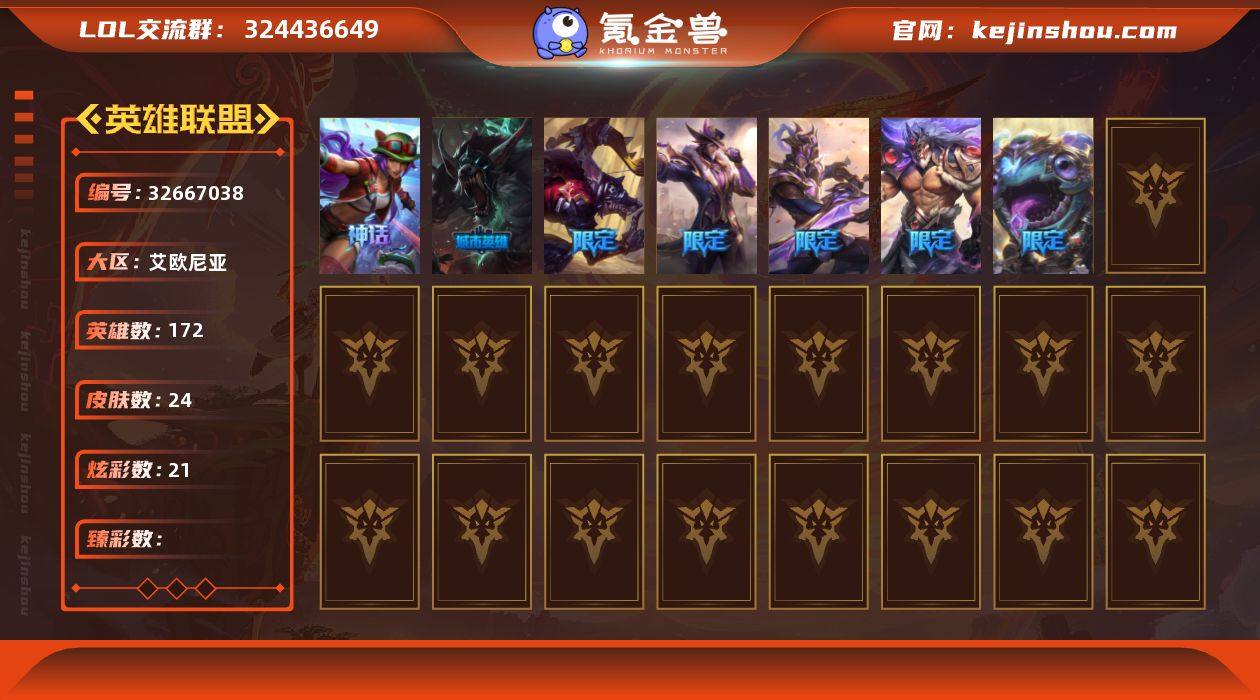 单双未定级段位-172英雄-24皮肤-21炫彩-0终极-1神话-7限定-1传说-5史诗 【神话皮肤】:十五周年纪念希维尔 【限定皮肤】:胜利之王泰达米尔,胜利巨口克格莫,胜利剑圣易,胜利之运崔斯特,胜利女神菲奥娜,暗影沃里克,都铎王朝图奇 【传说皮肤】:枯萎之壤泽拉斯 【史诗皮肤】:狼外婆沃里克,符文战神雷克顿,龙骑统帅嘉文四世,面包之王潘森,暗黑女武神黛安娜 【其他皮肤】:宗师级法师训练师瑞兹,睡衣守护者厄运小姐,千纸凤凰艾尼维亚,光明哨兵艾瑞莉娅,白魔法师维迦,黑色玫瑰假面舞会伊莉丝,万人敌潘森,丧尸杀手潘森,荣誉使者慎,胜利女神菲奥娜,深渊恐惧锤石