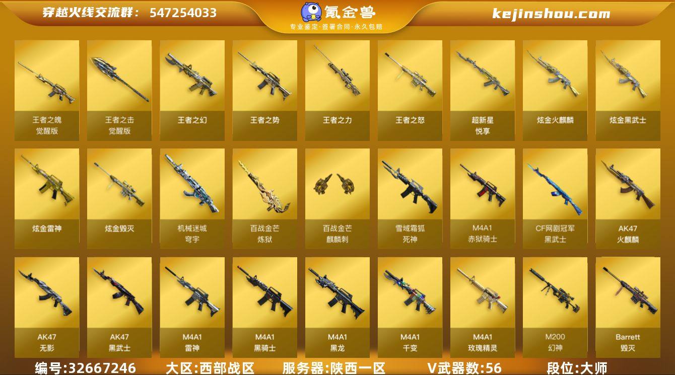 【940363】陕西一区-63V-8王者武器数-4炫金武器数 【热门武器】:QBZ03-金色蔷薇,HK417-朱雀,M200-幻神,死亡之眼,C.A.T,M4A1-黑骑士,汤姆逊-烈龙*6,加特林-炼狱*2,降世魔童*2,沙鹰-修罗 【王者炫金武器】:超新星-悦享,王者之幻,王者之势,王者之怒,王者之力,炫金火麒麟,炫金雷神,炫金武士,炫金毁灭 【音效卡】:AK47-火麒麟音效卡,M4A1-雷神音效卡,M4A1-黑骑士音效卡,Barrett-毁灭音效卡,炼狱-百战金芒-庆典舞曲音效卡,死神-雪域霜狐-怀旧音效卡 【皮肤】:雷神-暗月,雷神-荣耀之魄,雷神-星空,M4A1-再燃火线,火麒麟-轻羽皮肤,毁灭耀金皮肤,黑龙-能量核心,黑骑士耀金皮肤,无影-能量核心,无影耀金皮肤,AK47-黑武士-361,战神-粉色甜心皮肤,战神-紫绶金章皮肤*4,战神-流金岁月皮肤*3,极光-能量核心,轻型军用手斧-再燃火线 【角色】:零,葵,樱,迷迭香,王者之瞳,雪域霜狐,奇洋探员,乔伊教练,云海玲珑,葵-阿尔法武装,空,初恋灵狐,兰-新年限定,零-水下丽影,灵狐者-X,灵狐者-黄金海岸,龙儿,龙儿-小淘气,潘多拉-X,潜龙队-X,蜀雪,新娜塔莎,潘多拉-N 【人偶武器】:M4A1-雷神-精英刀锋,C.A.T,迷你生化手雷*2,生化手雷-机甲...