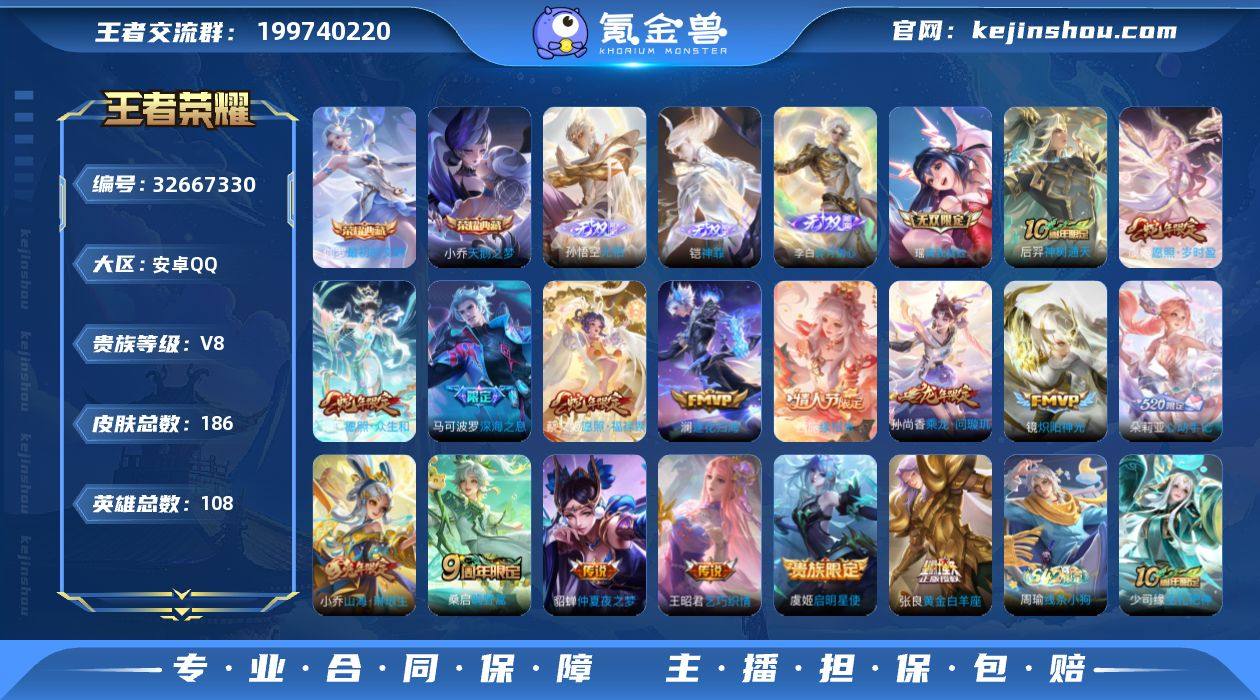 安卓Q-V8-尊贵铂金II段位-108英雄-186皮肤-2典藏皮肤-4无双-16传说-49史诗 【英雄全皮】:孙权全皮,空空儿全皮 【荣耀典藏】:小乔天鹅之梦,伽罗最初的交响 【无双皮肤】:孙悟空无相,铠神罪,李白碎月剑心,瑶真我赫兹 【传说皮肤】:后羿神树通天,西施续相思,妲己愿照众生和,蔡文姬愿照福禄聚,虞姬愿照岁时盈,桑启鸣野蒿,朵莉亚心动手记,孙尚香乘龙问璇玑,澜逐花归海,小乔山海琳琅生,马可波罗深海之息,王昭君乞巧织情,镜炽阳神光,虞姬启明星使,张良黄金白羊座,貂蝉仲夏夜之梦 【限定皮肤】:大乔绒语心约,姜子牙天穹之誓,狄仁杰阴阳师,小乔山海琳琅生,赵云皇家上将,妲己热情桑巴,孙尚香蔷薇恋人,马可波罗深海之息,狄仁杰魔术师,达摩沙漠行僧,项羽海滩派对,安琪拉魔法小厨娘,兰陵王金庭之子,虞姬启明星使,干将莫邪冰霜恋舞曲,蔡文姬奇迹圣诞,沈梦溪大漠名商,鲁班大师探海日志,桑启海盐诗旅,张良古海寻踪,鬼谷子天穹祈灯,李白碎月剑心,大乔乘龙忆丹青,安琪拉乘龙聚宝船,孙尚香乘龙问璇玑,沈梦溪龙舞盛年,刘邦剑破天穹,程咬金群星魔术团,朵莉亚心动手记,周瑜熔金海岸 【年限皮肤】:小乔山海琳琅生,孙尚香乘龙问璇玑,大乔乘...