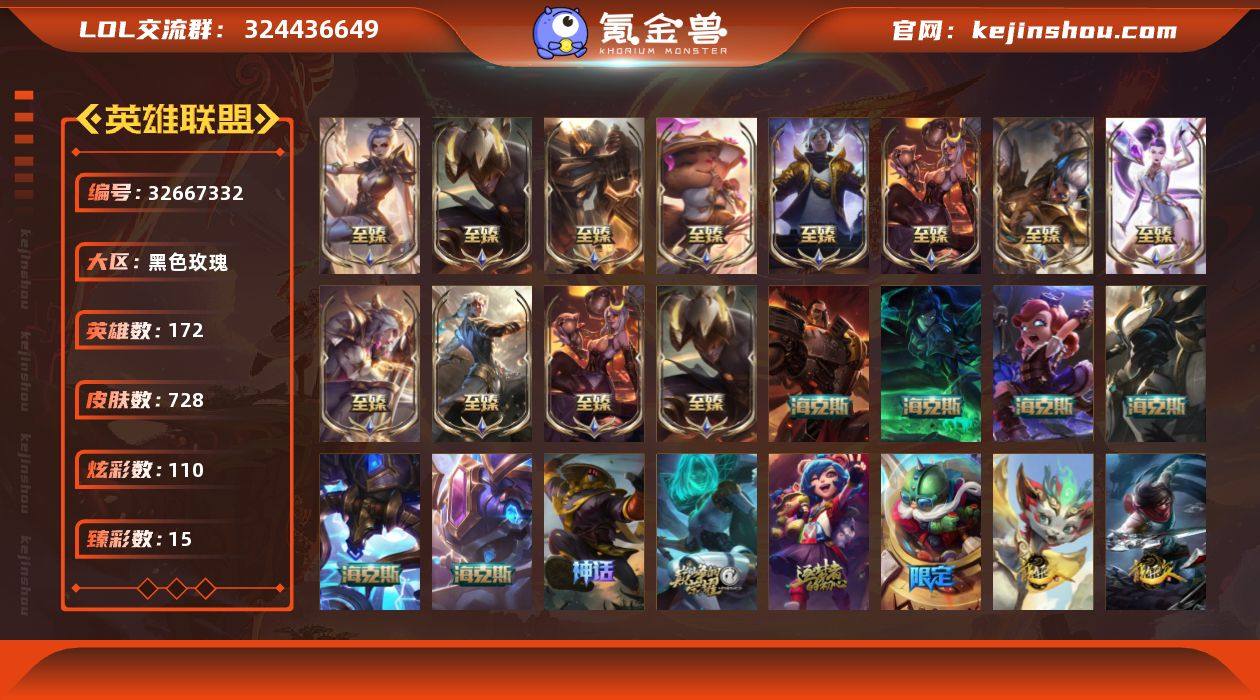 钻石段位-172英雄-728皮肤-110炫彩-0终极-21神话-126限定-63传说-192史诗 【神话皮肤】:十周年纪念安妮,源代码乐芙兰,新卧虎藏龙贾克斯 【至臻皮肤】:至臻灵魂莲华提莫,至臻黑夜使者李青,至臻黑夜使者李青(2022),至臻烈焰美人薇恩,至臻烈焰美人薇恩(2022),至臻王国机神玄武盖伦,至臻玉剑传说武剑仙锐雯,至臻女帝黛安娜,至臻黑夜使者凯隐,至臻KDAALLOUT卡莎,至臻真实伤害亚索,至臻神龙尊者炎龙瑟提 【海克斯皮肤】:海克斯科技安妮,海克斯科技阿利斯塔,摄魂使者薇恩,海克斯科技克格莫,零之枪骑赫卡里姆,恐惧新星德莱厄斯 【臻彩皮肤】:天龙之子卡莎飞龙乘云,无畏骑士瑟庄妮赤子初心,吕布奉先炫金战神,墨之影武者亚索金墨耀影,冠军之隐劫凯旋圣装,霸天巨兽雪崩墨菲特,源计划火菲奥娜惩戒,可爱可爱粉红红布里茨,魔女阿卡丽虚荣,净雪之月莫甘娜冬虹,幻灵战斗兔阿萝拉梦幻强袭,红莲之刃锐雯,北极星钢影卡蜜尔智慧纽带,心之钢伊泽瑞尔天纵才华 【年限皮肤】:银龙裁决泰隆,古琴余韵娑娜,定海神珍孙悟空,你看见过我的熊猫吗安妮,广寒仙子嫦娥,紫金罗刹莫甘娜,北辰之威内瑟斯,龙腾虎跃瑟提,天龙之子斯莫德,龙马烈焰波比 【情人节限定】:...