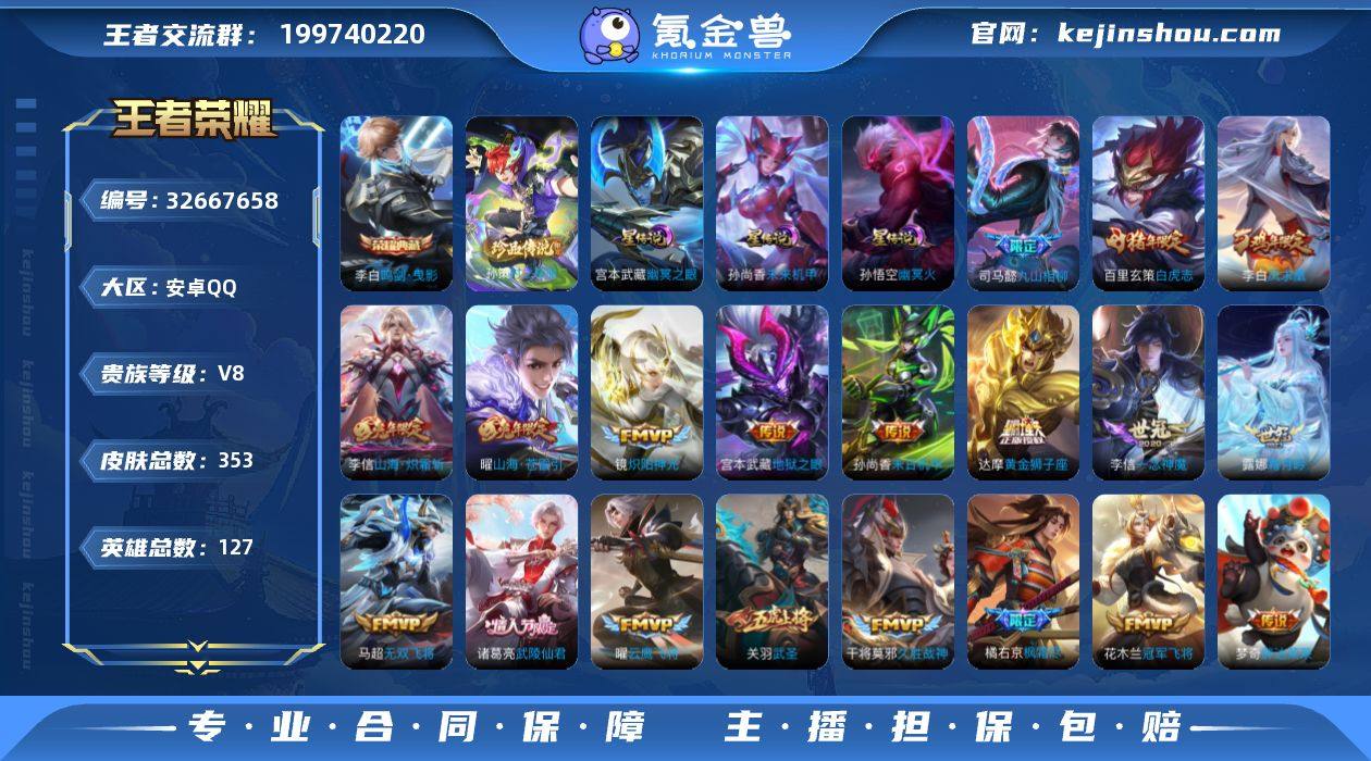 【精品推荐·鸣剑曳影·神罪·孙策时之奇旅·山海苍雷引·山海炽霜斩·愿照山河定·九山相柳·白虎志·一念神魔·武陵仙君·燃星之曲·死亡执政官·纵目迁山·无二次包过】w21307-安卓Q-127英雄-353皮肤-23王者印记-铭文-贵族积分6w【贵族8】【1典藏·1无双·1珍品·3星传说·27传说·24按键·211幸运值】【因赛季更新游戏段付以上号为准!】 【英雄全皮】:司马懿全皮,孙权全皮,橘右京全皮,赵怀真全皮,空空儿全皮 【荣耀典藏】:李白鸣剑曳影 【无双皮肤】:铠神罪 【珍品传说】:孙策时之奇旅 【星元皮肤】:孙尚香未来机甲,孙悟空幽冥火,宫本武藏幽冥之眼 【传说皮肤】:杨戬纵目迁山,后羿神树通天,大司命死亡执政官,司马懿九山相柳,司空震愿照山河定,桑启鸣野蒿,露娜霜月吟,花木兰燃星之曲,曜山海苍雷引,李信山海炽霜斩,橘右京枫霜尽,马超无双飞将,镜炽阳神光,虞姬启明星使,关羽武圣,曜云鹰飞将,李信一念神魔,干将莫邪久胜战神,达摩黄金狮子座,百里玄策白虎志,花木兰冠军飞将,梦奇胖达荣荣,诸葛亮武陵仙君,李白凤求凰,孙尚香末日机甲,宫本武藏地狱之眼,孙悟空地狱火 【限定皮肤】:白起狰,姜子牙天穹之誓,狄仁杰阴阳师,虞姬凯尔特女王,赵云皇家上将,赵云...