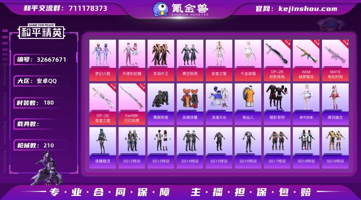 【kyhp1107】安卓 手Q-7粉装-5特效枪-0载具-2粉色飞行器-65154热力值-12王牌印记-180套装-210枪皮 【热门品类】:粉装-梦幻火箭,套装-浪漫天命,套装-龟仙人,套装-暗影哥特 【粉色套装】:粉装-天使彩虹糖,粉装-梦幻火箭,粉装-炙焰牛王,粉装-青空秋雨,角色-圣堂之誓,角色-千金淑猫,角色-蜜语粉晶 【粉色枪皮等级】:AKM-绿萝繁花(五级),M416-电玩时刻(五级),Kar98K-巳巳如意(四级),DP-28-圣堂之誓(五级),DP-28-豹影疾电(五级) 【粉色枪皮】:AKM-绿萝繁花,M416-电玩时刻,Kar98K-巳巳如意,DP-28-圣堂之誓,DP-28-豹影疾电 【粉色飞行器】:炫彩糖果飞行器,心之恋语飞行翼 【粉色降落伞】:梦幻火箭降落伞,伏魔团降落伞,阿狸红降落伞,垂柳戏鸭降落伞,音爆索尼克降落伞,蜜语绒猫降落伞,千金淑猫降落伞,星穹咏叹调降落伞,炫彩糖果降落伞,幻夜紫晶降落伞 【稀有套装】:套装-龟仙人,角色-都市丽猫,角色-绛羽幽主,角色-夜瞳黯灵,套装-雨过天青,套装-红釉青花 【稀有枪皮】:AKM-冰凉西瓜,AKM-夜灯,AKM-彩虹符号,AKM-生命誓言,AKM-破晓战魂,AKM-缤纷海域,AKM-萌趣颜团子,AKM-虎虎生威,AKM-龙的传人,M16A4-夜灯,M16A4-幻世战舞者,M16A4-甜心...