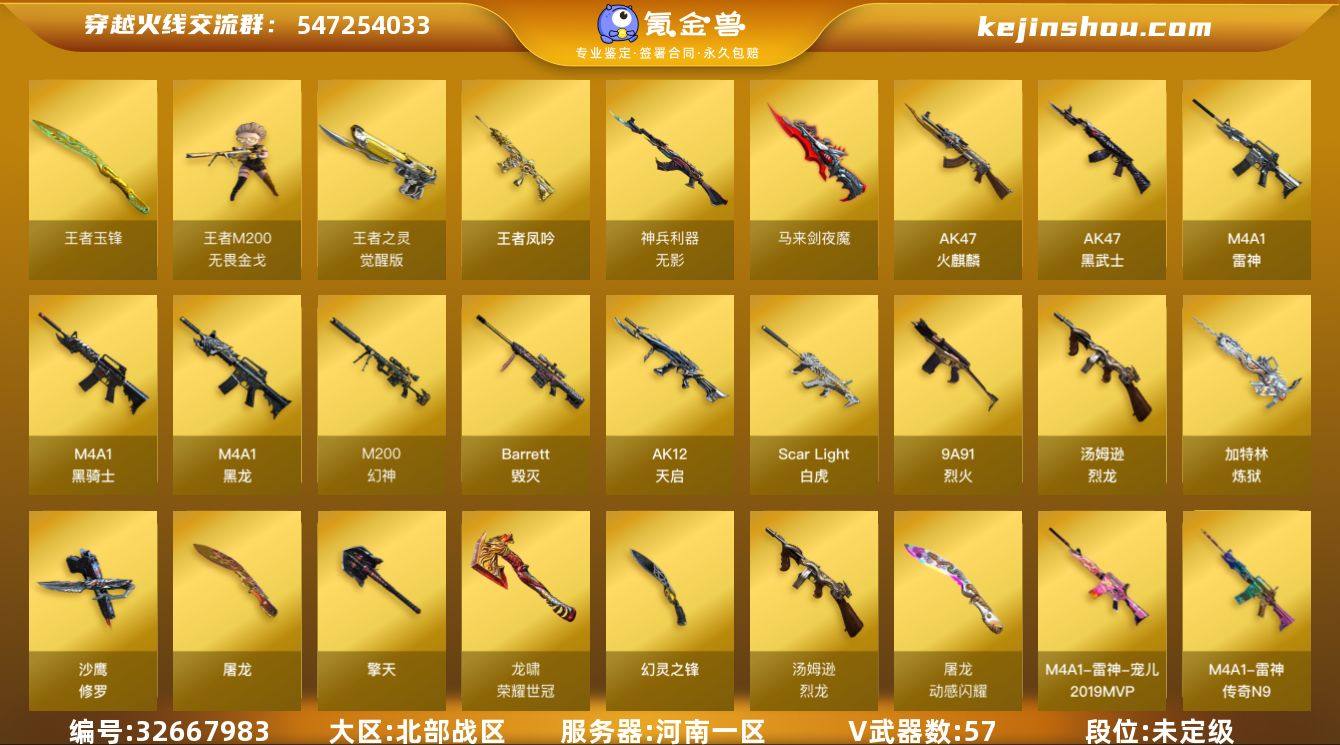 河南一区-71V-16王者武器数-1炫金武器数 【热门武器】:Scar Light-白虎,M200-幻神,Kar98K-星神,牛牛-AK47,M4A1-黑骑士,汤姆逊-烈龙*6,加特林-炼狱,斯泰尔-蝴蝶,羊驼玩偶,沙鹰-修罗*2,荣耀世冠-龙啸,金刚伞 【王者炫金武器】:王者凤吟,王者玉锋,高爆手雷-雷霆王者,炫金骑士 【音效卡】:M200-幻神音效卡,Barrett-毁灭音效卡,Scar Light-白虎音效卡,沙鹰-修罗-盛典舞曲音效卡*2,Barrett-碧霄极光音效卡,炼狱-百战金芒-庆典舞曲音效卡 【皮肤】:幻神-丹凤,幻神-宠儿-2021MVP,幻神-电竞之星 皮肤,星神-黯钢战甲 皮肤,雷神-荣耀之魄,雷神-传奇N9,雷神-宠儿-2019MVP,雷神-动感闪耀 皮肤,M4A1-再燃火线,雷神-神秘按键 皮肤,AK47-火麒麟-传奇EVEN,火麒麟-平天大圣,火麒麟-心动糖果,毁灭-暗月,毁灭-BEAN-2020MVP,毁灭-黑大圣皮肤,毁灭-英雄计划 皮肤,黑龙-能量核心,轻型军用手斧-再燃火线 【角色】:雨棠,曼珠沙华,零·纪元,王者樱-热浪之夏,王者葵-惊若翩鸿,王者涂鸦,乔伊教练,葵-阿尔法武装,幻面灵狐,暗夜-X,风暴女,嘉年华灵狐,娟娟,潘多拉-X,斯沃特-X,雪莉杨-摸金校尉,幽 【人偶武器】:王者M200-无畏金戈,斯泰尔-蝴蝶,泡...
