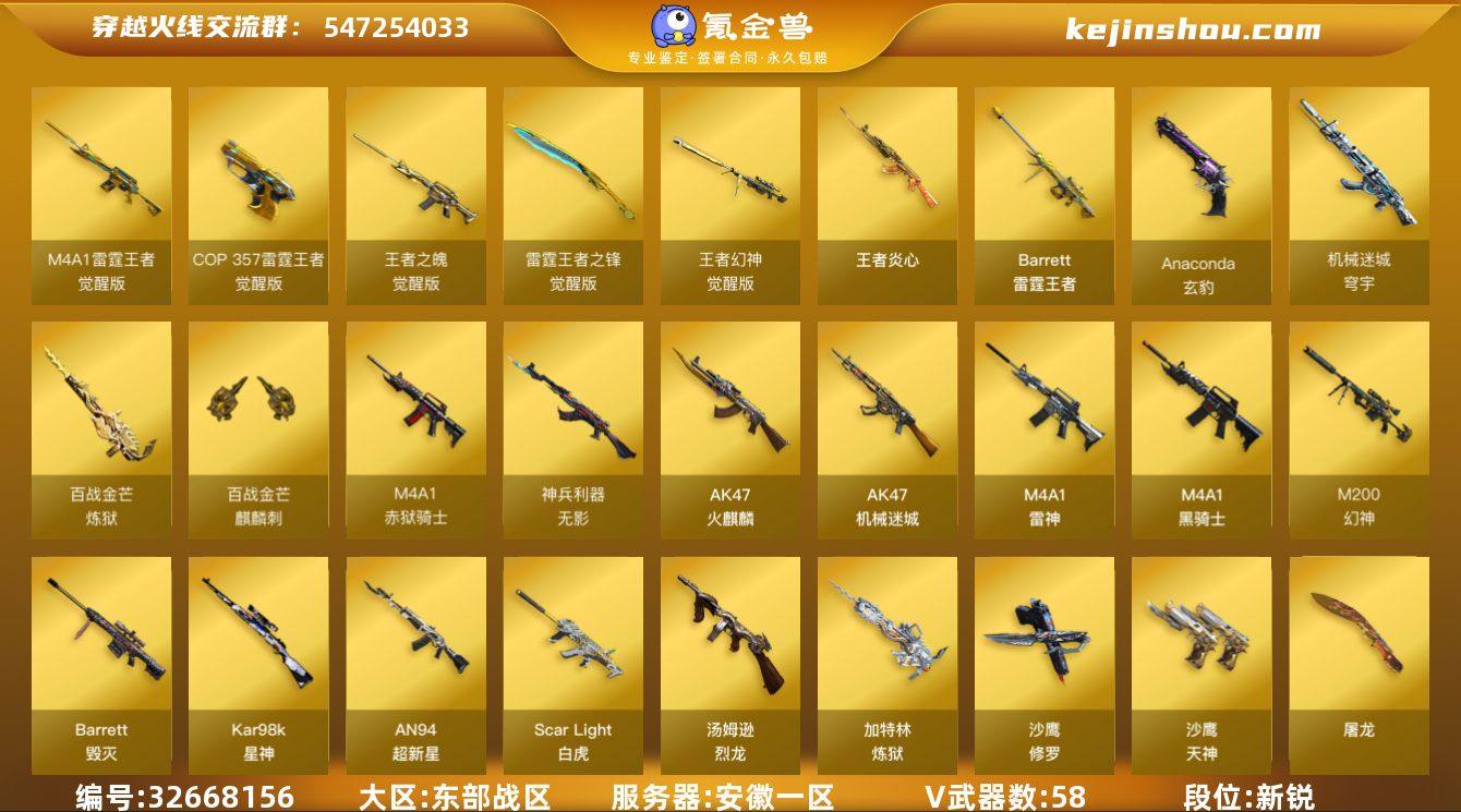 【ky6424】安徽一区-69V-16王者武器数-0炫金武器数 【热门武器】:Scar Light-白虎,M200-幻神,柯尔特-冠军之特,王者炎心,Kar98K-星神,M4A1-黑骑士,汤姆逊-烈龙*6,加特林-炼狱,斯泰尔-蝴蝶,沙鹰-修罗*5 【王者炫金武器】:王者炎心,Barrett-雷霆王者,高爆手雷-雷霆王者*2,烟雾弹-雷霆王者 【音效卡】:AK47-火麒麟音效卡,M4A1-雷神音效卡,M4A1-黑骑士音效卡,Barrett-毁灭音效卡,Scar Light-白虎音效卡,Kar98K-星神音效卡,Barrett-碧霄极光音效卡*2,炼狱-百战金芒-庆典舞曲音效卡 【皮肤】:幻神-冠军之幻,ScarLight-白虎-冠军之虎皮肤,雷神-星空,雷神-耀金皮肤,M4A1-再燃火线,火麒麟-平天大圣,火麒麟-百城,火麒麟-心动糖果,毁灭耀金皮肤,毁灭-战神张飞,HK417-朱雀-武当,轻型军用手斧-再燃火线 【角色】:零·纪元,战地猎狐,王者潘多拉,葵-阿尔法武装,幻面灵狐,初恋灵狐,芳心审判者,风暴女,虎妞,嘉年华灵狐,灵狐-花神,灵狐者-X,灵狐者-职业经理,龙儿,麻雀,潘多拉-X,潘多拉-甜心教官,斯沃特-X,铁骑荣耀,雪莉杨-摸金校尉,樱-战斗天使,幽,潘多拉-N 【人偶武器】:迷你宝贝,斯泰尔-蝴蝶,迷你深渊冰龙,迷你裂空之翼*4,迷你波...