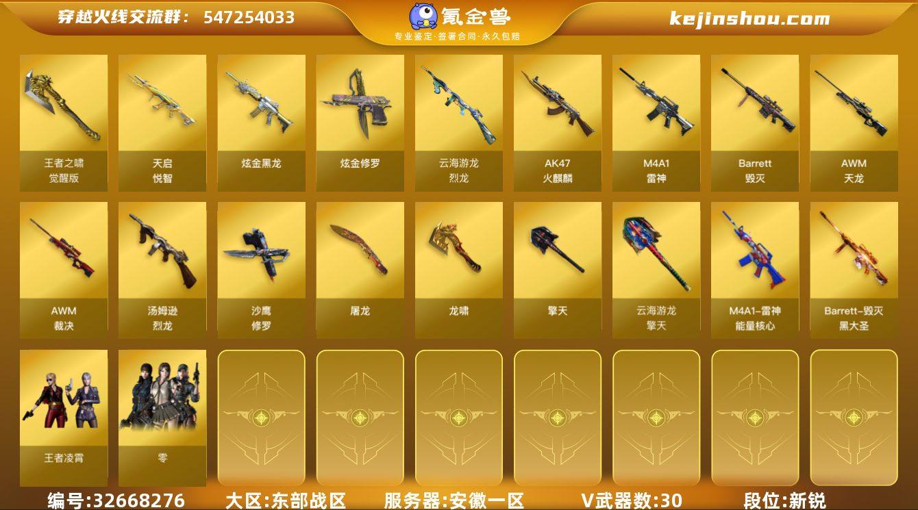 安徽一区-32V-2王者武器数-2炫金武器数 【热门武器】:死亡之眼*3,汤姆逊-烈龙*3,沙鹰-修罗*4 【王者炫金武器】:天启-悦智,炫金黑龙,炫金修罗 【皮肤】:雷神-能量核心,毁灭-黑大圣皮肤*2 【角色】:零,王者凌霄,云海玲珑,空,风暴女,嘉年华灵狐,灵狐者-职业经理,蜀雪 【人偶武器】:AWM-灵狐-15周年嘉年华 【暴走生化】:死亡之眼*3 【挑战大师】:神圣爆裂者-末日III 【英雄级武器】:AK47-火麒麟,M4A1-雷神*4,AWM-天龙,Barrett-毁灭*3,AWM-裁决,Barrett-金色蔷薇,汤姆逊-烈龙*3,烈龙-云海游龙,沙鹰-修罗*4,屠龙*3,龙啸,擎天,尼泊尔-雷霆,擎天-云海游龙,王者之啸-觉醒版,高爆手雷-雷霆,手雷-云海游龙,闪光弹-雷霆,烟雾弹-雷霆 【源级武器】:源-千变,源·火麒麟*3,魂·火麒麟-百城*2,源·雷神*2,魂·雷神-维纳斯,魂·雷神-新春神龙,魂·雷神-15周年嘉年华,御·雷神-葫芦兄弟,魂·黑骑士-幻能朋克*2,魂·黑骑士-破浪10年*2,御·黑骑士-冰魄,御·黑骑士·哪吒闹海,源·无影,魂·黑武士-锋芒破茧,源·机械迷城,魂·HK417-朱雀-凤灵,灵·HK417-朱雀-甜蜜火力,魂·QBZ03-金色蔷薇-萌杀,魂·9A91·烈火-电子连击,源·天龙,魂·天龙-彼岸花,AWM-裁决-...