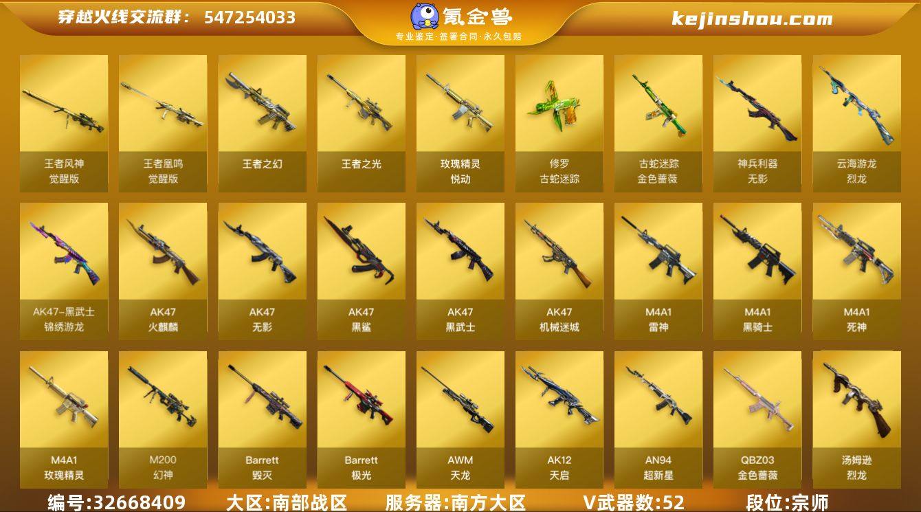 南方大区-59V-5王者武器数-0炫金武器数 【热门武器】:QBZ03-金色蔷薇*2,M4A1-青龙,M200-幻神,金色蔷薇-古蛇迷踪,修罗-古蛇迷踪,死亡之眼*2,M4A1-黑骑士,汤姆逊-烈龙,加特林-炼狱,COP-白鲨,沙鹰-修罗*6 【王者炫金武器】:王者之幻,玫瑰精灵-悦动,王者之光 【音效卡】:Barrett-毁灭音效卡 【皮肤】:雷神-能量核心,雷神-炽焰魔龙,雷神-源计划2.0专属 皮肤,火麒麟-雷神,火麒麟-心动糖果,毁灭-暗月*2,毁灭-冠军之怒,毁灭-英雄计划 皮肤,黑骑士-暗月*2,无影-暗月,无影-能量核心,死神-秘银*2,天启-暗月,天龙-能量核心,修罗-能量核心*5,修罗耀金皮肤,修罗-星空,修罗-冠军之魂,天神-暗月 【角色】:零,葵,关小雨,隼,零·纪元,王者-迷迭香,王者沙漠玫瑰,蛇隐宗,乔伊教练,云海玲珑,幻面灵狐,空,北极狐-X,初恋灵狐,电竞少女,芳心审判者,飞虎队-X,风暴女,虎妞,嘉年华灵狐,0号玩家,灵狐者-X,灵狐者-职业经理,麻雀,曼陀罗-X,潘多拉-X,潘多拉-甜心教官,青霞仙子,蛇姬,斯沃特-X,兔囡囡,新娜塔莎,影武者-X,团团 【人偶武器】:COP-白鲨,AWM-灵狐-15周年嘉年华,迷你牛牛,生化手雷-机甲核心,深渊终结者手雷 【暴走生化】:...