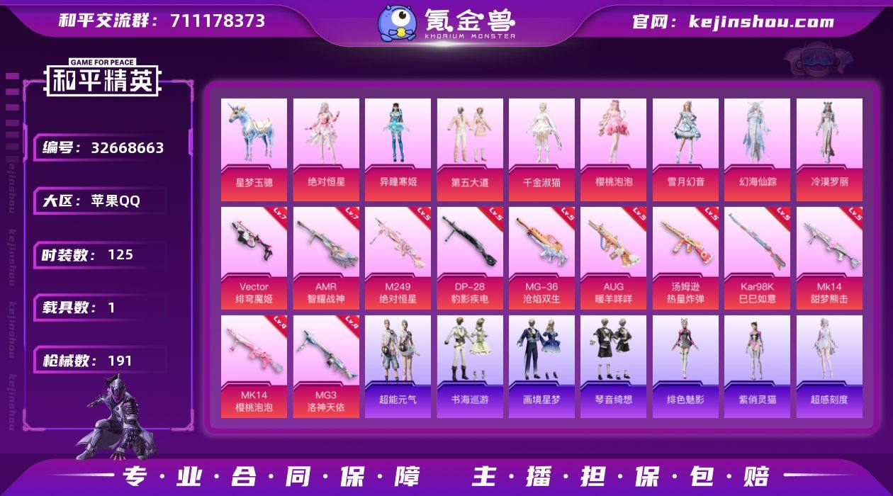 苹果 手Q-8粉装-14特效枪-1载具-4粉色飞行器-61527热力值-9王牌印记-125套装-191枪皮 【粉色套装】:角色-绝对恒星,粉装-第五大道,角色-千金淑猫,角色-樱桃泡泡,粉装-雪月幻音,角色-幻海仙踪,角色-冷漠罗丽,角色-异瞳寒姬 【粉色枪皮等级】:AUG-暖羊咩咩(五级),ACE32-萌骑漫游(一级),Vector-绯穹魔姬(七级),汤姆逊-热量炸弹(五级),AKS-74U-森灵之息(五级),Kar98K-巳巳如意(五级),Mk14-樱桃泡泡(四级),Mk14-甜梦熊击(五级),Mk14-福马献瑞(五级),AMR-智耀战神(七级),M249-绝对恒星(五级),DP-28-豹影疾电(五级),MG3-洛神天依(四级),MG-36-沧焰双生(五级) 【粉色载具】:星梦玉骢 【粉色枪皮】:AUG-暖羊咩咩,ACE32-萌骑漫游,Vector-绯穹魔姬,汤姆逊-热量炸弹,AKS-74U-森灵之息,Kar98K-巳巳如意,Mk14-樱桃泡泡,Mk14-甜梦熊击,Mk14-福马献瑞,AMR-智耀战神,M249-绝对恒星,DP-28-豹影疾电,MG3-洛神天依,MG-36-沧焰双生 【粉色飞行器】:绝对恒星飞行器,炫彩糖果飞行器,BEARBRICK飞行器,飞天猪飞行器 【粉色降落伞】:绝对恒星降落伞,洛神天依降落伞,蜜语绒猫降落伞,精灵梦叶罗丽降落伞,星梦奇缘降落伞,拳皇·狂花道降落伞,英伦信使降落伞...
