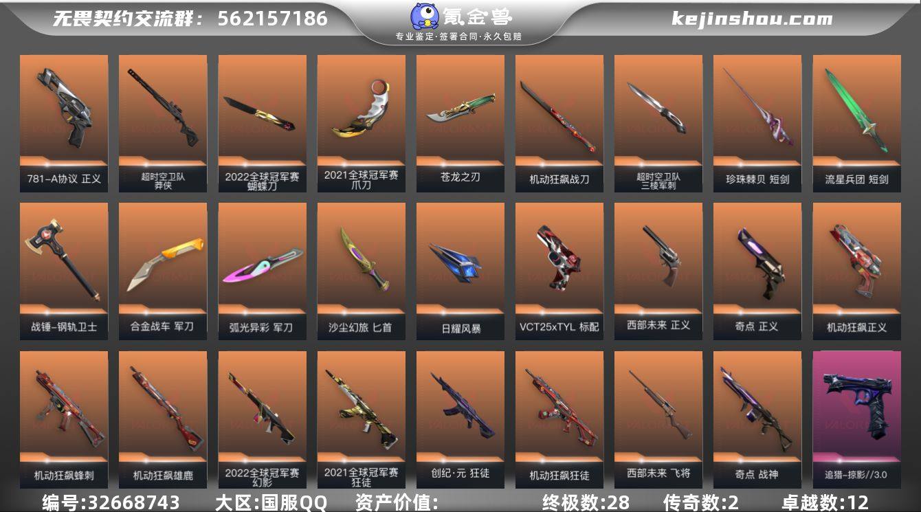 【套装】:2022全球冠军赛套装,2021全球冠军赛套装,机动狂飙套装 【英雄】:幻棱,炼狱,维斯,暮蝶,钛狐,壹决,铁臂,捷风,雷兹,幽影,不死鸟,贤者,猎枭,蝰蛇,零,芮娜,奇乐,尚勃勒,霓虹,斯凯,夜露,星礈,K/O,海神,盖可,黑梦,钢锁 【近战武器】:近战武器-2022全球冠军赛 蝴蝶刀,近战武器-2021全球冠军赛 爪刀,近战武器-碎心裂刃,近战武器-超时空卫队 三棱军刺,近战武器-5周年//公测重制版 苍龙之刃,近战武器-黑波之刃,近战武器-珍珠棘贝 短剑,近战武器-流星兵团 短剑,近战武器-钢轨卫士 战锤,近战武器-合金战车 军刀,近战武器-洪荒双斩,近战武器-弧光异彩 军刀,近战武器-机动狂飙 战刀,近战武器-沙尘幻旅 匕首,近战武器-日耀风暴 遗器 【狂徒】:狂徒-2021全球冠军赛,狂徒-机动狂飙,狂徒-创·纪元,狂徒-堕天遗武,狂徒-盖亚的复仇,狂徒-钢轨卫士,狂徒-弧光异彩,狂徒-流星兵团,狂徒-沙尘幻旅 【幻影】:幻影-2022全球冠军赛,幻影-般若假面,幻影-侦察力量,幻影-异鳞魔蛇,幻影-合金战车,幻影-噬源兽防卫工程,幻影-珍珠棘贝,幻影-战术小伙伴 【戍卫】:戍卫-侦察力量,戍卫-钢轨卫士,戍卫-珍珠棘贝,戍卫-彩梦之城,戍卫-花漾...
