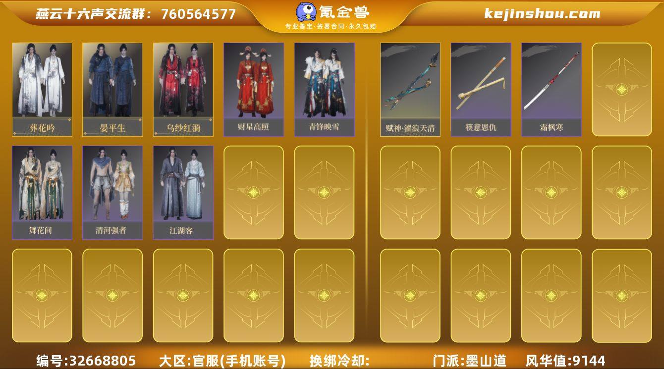 燕云十六声 游戏账号卖家说明 🔹 账号基础信息 - 服务器:官服(请补充具体服务器名) - 角色等级:100级(满等级) - 战力鹅度:3.336鹅(主流毕业战力) - 八音窍:已使用1颗 - 风华值:9144(外观收集中等偏上) - 已游历天数:128天 - 天工等级:5级,叠音平均35层(探索进度完整) 🔹 核心武学与心法 - 武学:斩雪刀法100级、明川药典100级(双满阶成型流派) - 心法:霜天白夜(1重)、长生无相、孤忠不辞、穿喉诀等(逐寇流派完整搭配) - 奇术:韦陀正法6重·30段(已达赛季巅峰,群体伤害+控制成型) 🔹 核心外观与装备 - 武器外观:赋神·濯浪天清(金色横刀特效,价值1200御武兑换,核心亮点) - 装备:全套“断+江+弦”品质装备,装备调律已解锁 - 其他:默认横刀、筷意恩仇等武器外观,无额外稀有载具/金时装展示 🔹 交易安全说明 1. 账号为本人实名注册,支持平台官方换绑,换绑后将彻底与本人手机号/邮箱解绑,买家可永久使用。 2. 交易全程走平台交易流程,绝不私下交易,保障双方资金与账号安全。