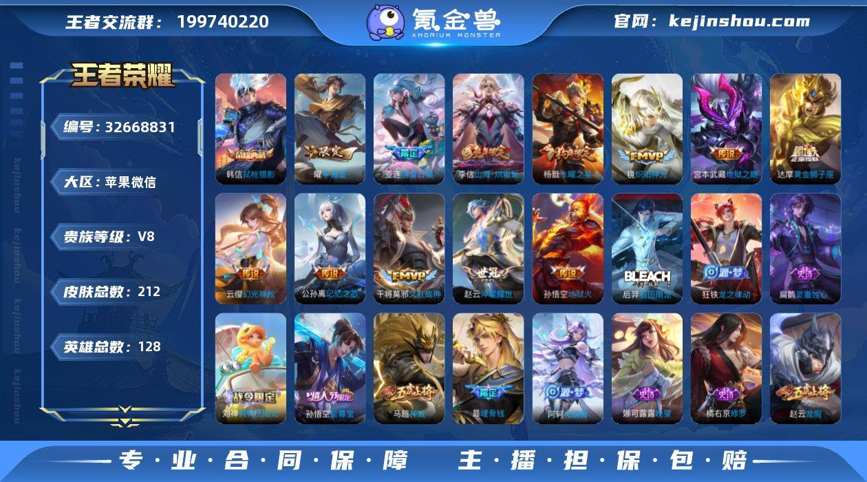 [17930400]V8 1典藏 1无双 1珍品传说 18传说 128英雄 212皮肤 可修改实名 【英雄全皮】敖隐全皮,孙权全皮,蚩奼全皮,大禹全皮 【稀有英雄】大司命,敖隐(小龙人),夏洛特(夏师傅),金蝉(唐僧),戈娅,赵云,嬴政(始皇帝),韩信(韩跳跳),艾琳,不知火舞,娜可露露(鸟人),橘右京(橘子) 【荣耀水晶】弑枪猎影(韩信典藏) 【无双皮】问心剑 【珍品传说】沧流箭 【传说皮】淬星耀世,久胜战神,山海·炽霜斩(李信年限),黄金狮子座,末日机甲-孙尚香(绿蚂蚱),天秀幻梦,炽阳神光,地狱之眼,记忆之芯(机甲兔),落雪白狼,地狱火,李逍遥,神骥·赴朔漠,幻光神枪 【珍宝阁皮】女武神 【赛季/战令皮】火炮绅士,醍醐杖(s20),大漠名商(s28),御銮(s16),沙漠行僧(s26),御旌(s15),星界游侠,云间偶戏,金庭之子(s27),擒涛扼浪(s31),探海日志(s32),疑决卦(s19),原初探秘者(s21),潮玩骑士王,海盐诗旅(s30),万华元夜(s22),幻夜卜梦,演武夺筹(s23),云中旅人(s29),神迹守卫-墨子,混沌棋(s18),胡桃异想国,暖冬·兔眠,驱傩正仪(s24) 【史诗皮】乘风破浪,节奏热浪,化蝶舞,匿光破解者,曙光守护者,线条小狗-小乔,幽灵船长,乱世虎臣,茶境仙,石田雨龙,水果甜心,九幽镇关,电玩小子(小书包),紫霞仙子,末日机甲-吕布,天秀幻...