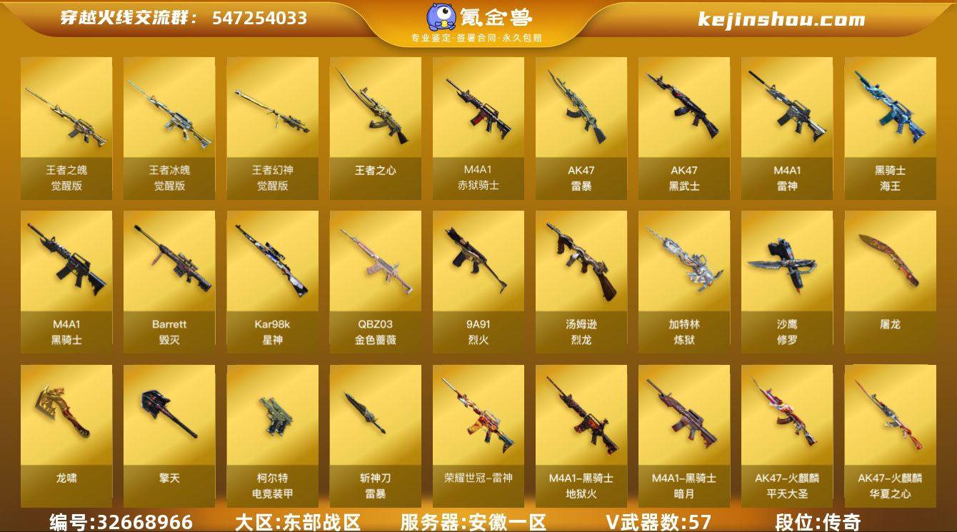 安徽一区-66V-4王者武器数-0炫金武器数 【热门武器】:QBZ03-金色蔷薇,荣耀世冠-雷神,Kar98K-星神,M4A1-黑骑士,汤姆逊-烈龙*2,加特林-炼狱*2,斯泰尔-蝴蝶,USP-雷暴,沙鹰-修罗*5 【王者炫金武器】:王者之心 【音效卡】:M4A1-雷神音效卡,M4A1-黑骑士音效卡 【皮肤】:雷神-荣耀之魄,火麒麟-华夏之心,火麒麟-平天大圣,毁灭-英雄计划 皮肤,黑骑士-暗月,黑骑士-地狱火 【角色】:春,零·纪元,王者玲珑,幻面灵狐,暗夜-X,芳心审判者,娟娟,潘多拉-X,邱刚敖,斯沃特-X,职业选手,团团 【人偶武器】:斯泰尔-蝴蝶,AWM-灵狐-15周年嘉年华,迷你牛魔王 【暴走生化】:超级对讲机 【挑战大师】:神圣爆裂者III,激光毁灭者III 【英雄级武器】:M4A1-雷神*2,M4A1-黑骑士,AK47-黑武士,AK47-雷暴,QBZ03-金色蔷薇,9A91-烈火,王者之魄-觉醒版,王者冰魄-觉醒版,黑骑士-海王,荣耀世冠-雷神,Barrett-毁灭,Kar98K-星神,王者幻神-觉醒版,加特林-炼狱*2,汤姆逊-烈龙*2,沙鹰-修罗*5,USP-雷暴,柯尔特-电竞装甲,屠龙*2,龙啸*4,擎天,斩神刀-雷暴,屠龙-电竞之星,高爆手雷-雷暴*7,闪光弹-雷暴*7,烟雾弹-雷暴*7,M4A1-赤狱骑士,AK47-竞魂无影 【源级武器...