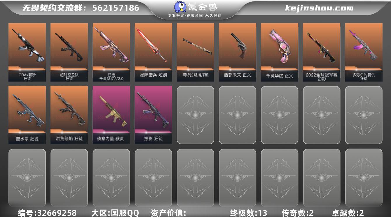 【英雄】:幻棱,炼狱,维斯,暮蝶,钛狐,壹决,铁臂,捷风,幽影,不死鸟,贤者,猎枭,零,芮娜,奇乐,尚勃勒,霓虹,斯凯,夜露,K/O,盖可,黑梦,钢锁 【近战武器】:近战武器-碎心裂刃,近战武器-影钩,近战武器-黑波之刃,近战武器-镭切,近战武器-阿特拉斯指挥部 甩棍,近战武器-星际猎兵 短剑 【狂徒】:狂徒-洪荒怒焰,狂徒-塑水宗,狂徒-多弥尔的复仇,狂徒-ORA x 颗秒,狂徒-千灵华绽//2.0,狂徒-超时空卫队,狂徒-掠影,狂徒-冬季仙境 【幻影】:幻影-2022全球冠军赛 【骇灵】:骇灵-侦察力量 【正义】:正义-千灵华绽,正义-西部未来 【卡面】:热舞环节 卡面,超能偶像 卡面,无畏契约GO!第一卷:芮娜 卡面,无畏契约GO!第一卷:零 卡面,《双城之战》金克丝 卡面,无畏契约GO!第一卷:贤者 卡面,钢锁vs盖可 卡面,夯实根基 卡面,代号红色 卡面,新兵报到 卡面,V契约 卡面,无畏契约 卡面 【喷漆】:霓光四射 喷漆,买装还是存钱 喷漆,关门放狗 喷漆,飓刃涂鸦 喷漆 ,胜利属于无畏契约 喷漆,GLHF 喷漆,无畏契约 喷漆 【挂饰】:无畏契约GO!第一卷 零 挂饰,天外飞客 挂饰,无畏契约 纪念币 挂饰