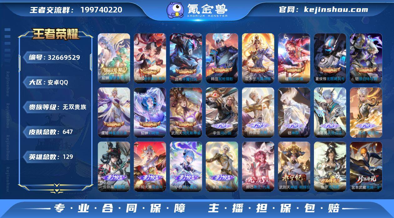 【王者荣耀】珍品无双1 典藏11 无双14 珍品传说10 传说107 史诗216 英雄129 皮肤647 贵族无双级 珍品无双:馥梦繁花__荣耀典藏:无限飓风号|武则天|神鉴启示录|银白咏叹调|幻阙歌|九霄神辉|倪克斯神谕|弑枪猎影|拾光映像|千魇归渊|颠倒童话·魔镜__无双皮肤:群星魔术团|时之魔女|碎月剑心|真我赫兹|离恨烟|花合斗|雪境奇遇|器灵·螭龙剑|青丘·九尾|神器·明辉仪|天机白泽|神罪|无相|问心剑__珍品传说:江户川柯南|怪盗基德|孙策-时之奇旅|器灵·落星盏|兔狲·蓬尾|大耳狗之梦|酷洛米之心|朽木白哉|黑崎一护|沧流箭__传说皮肤:鸣野蒿|枫霜尽|前尘镜|深海之息|无尽星芒|无双飞将|挚爱花嫁|挚爱之约|启示之音|花朝如约|补天|孙尚香-异界灵契|炽阳神光|启明星使|胖达荣荣|地狱之眼|地狱火|海洋之心|孙策-末日机甲|仲夏夜之梦|云霓雀翎|久胜战神|黄金狮子座|狄仁杰-超时空战士|黄金射手座|黄金白羊座|猫影幻舞|刘备-时之恋人|一念神魔|冠军飞将|飞鸢探春|李逍遥|游龙清影|淬星耀世|瑶-时之祈愿|炽翼辉光|电玩·雷克斯|绯月行|浮生妄|鹤羽星尊|画中仙|记忆之芯|孙尚香-末日机甲|齐天大圣|白虎志|安琪拉-追逃游戏|凤求凰|黄金天蝎座|金乌负日|兰陵王-默契交锋|零号·赤焰|落雪白狼|吕布-曦玄引|...