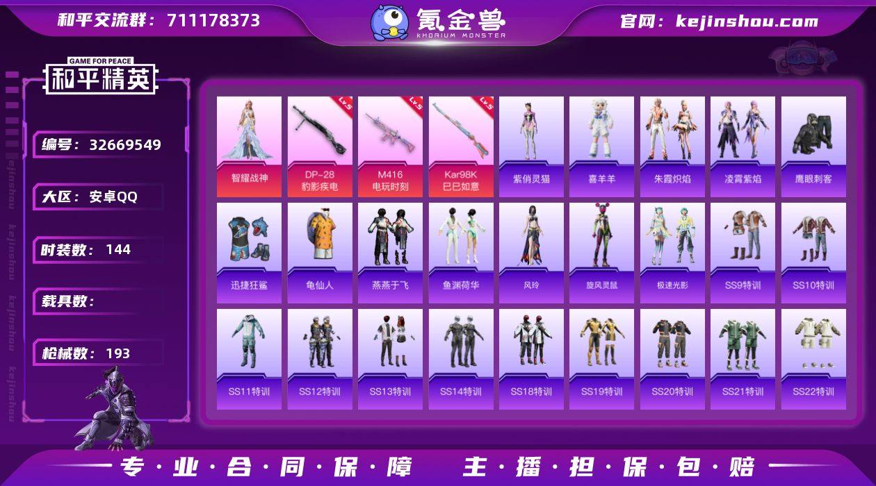 安卓 手Q-1粉装-5特效枪-0载具-1粉色飞行器-52740热力值-11王牌印记-144套装-193枪皮 【热门品类】:套装-龟仙人 【粉色套装】:角色-智耀战神 【粉色枪皮等级】:M416-电玩时刻(五级),AKS-74U-森灵之息(五级),Kar98K-巳巳如意(五级),Mk14-福马献瑞(五级),DP-28-豹影疾电(五级) 【粉色枪皮】:M416-电玩时刻,AKS-74U-森灵之息,Kar98K-巳巳如意,Mk14-福马献瑞,DP-28-豹影疾电 【粉色飞行器】:炫彩糖果飞行器 【粉色降落伞】:星穹咏叹调降落伞,无垠阁降落伞,异瞳寒姬降落伞,炫彩糖果降落伞 【稀有套装】:套装-龟仙人,套装-雪国风尚,套装-炫彩糖果,套装-马上来财,套装-燕燕于飞,套装-鱼渊荷华,角色-风玲,套装-旋风灵鼠,套装-极速光影,套装-朱霞炽焰,套装-凌霄紫焰,玩偶服-喜羊羊,角色-紫俏灵猫 【稀有枪皮】:AUG-冰晶雪宝,AKM-夜灯,AKM-彩虹符号,AKM-影袭,AKM-生命誓言,AKM-破晓战魂,AKM-缤纷海域,AKM-霓虹街区,AKM-龙的传人,M16A4-幻世战舞者,M16A4-红色方程式,M16A4-蓝色火焰,SCAR-L-炫彩节奏,SCAR-L-玉兔迎春,SCAR-L-甜蜜旋律,SCAR-L-红色方程式,M416-夜灯,M416-糯团青竹,M416-红色方程式,M416-蓝色火焰,GROZA-异彩先驱,AUG-...