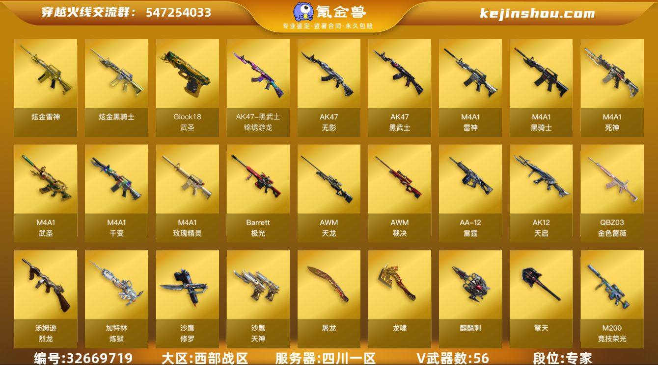 四川一区-58V-1王者武器数-2炫金武器数 【热门武器】:QBZ03-金色蔷薇,M200-竞技荣光,死亡之眼,M4A1-黑骑士,汤姆逊-烈龙,加特林-炼狱*2,USP-雷暴,沙鹰-修罗 【王者炫金武器】:王者之魄闪光弹,炫金骑士,炫金雷神 【音效卡】:M4A1-黑骑士音效卡,AWM-裁决音效卡 【皮肤】:雷神-暗月,雷神-脉冲核心,火麒麟-平天大圣*2,毁灭-黑大圣皮肤,毁灭-魔灵皮肤,M4A1-千变-孔明皮肤,黑骑士-电玩青兔皮肤,无影-暗月,天启-暗月,AK47-B-常胜将军-曹操,AK47-B-常胜将军-刘备,AK47-B-常胜将军-孙权,AWM-再燃火线 【角色】:葵,电竞教官-云悠悠,王者之瞳,王者凌霄,暗夜-X,初恋灵狐,芳心审判者,飞虎队-X,风暴女,嘉年华灵狐,荆棘玫瑰,娟娟,灵狐者-七夕宝贝,龙儿-小淘气,曼陀罗-礼服,潘多拉-X,潘多拉-甜心教官,铁骑荣耀,兔囡囡,新灵狐者,樱-战斗天使,影武者-X,团团 【人偶武器】:火麒麟-灵狐,M4A1-雷神-精英刀锋,海滩汪汪-巴雷特,迷你深渊冰龙,夺魂,生化手雷-机甲核心,迷你超能女侍 【暴走生化】:死亡之眼 【挑战大师】:冰龙粉碎者-白马银枪 【英雄级武器】:M4A1-千变,M4A1-雷神,M4A1-黑骑士,AK47-无影*2,M4A1-死神,AK47-黑武士,AK12-...