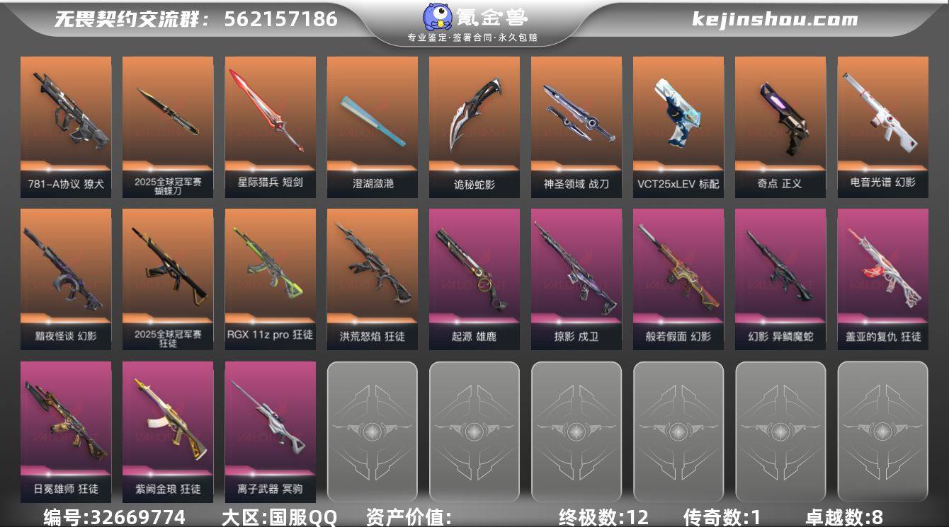 【套装】:2025全球冠军赛套装 【英雄】:幻棱,炼狱,维斯,暮蝶,钛狐,壹决,铁臂,捷风,雷兹,幽影,不死鸟,贤者,猎枭,蝰蛇,零,芮娜,奇乐,尚勃勒,霓虹,斯凯,夜露,星礈,K/O,海神,盖可,黑梦,钢锁 【近战武器】:近战武器-2025全球冠军赛 蝴蝶刀,近战武器-澄湖潋滟,近战武器-诡秘蛇影 军刀,近战武器-神圣领域 战刀,近战武器-星际猎兵 短剑 【狂徒】:狂徒-2025全球冠军赛,狂徒-洪荒怒焰,狂徒-RGX 11z Pro,狂徒-盖亚的复仇,狂徒-日冕雄师,狂徒-紫阙金琅,狂徒-诡秘蛇影 【幻影】:幻影-黯夜怪谈,幻影-电音光谱,幻影-般若假面,幻影-异鳞魔蛇,幻影-神圣领域,幻影-末日之翼,幻影-电音光谱 【戍卫】:戍卫-掠影,戍卫-月球哨兵,戍卫-折光棱晶 【獠犬】:獠犬-781-A协议,獠犬-神圣领域 【冥驹】:冥驹-离子武器,冥驹-星云暗涌 【飞将】:飞将-末日之翼 【莽侠】:莽侠-诡秘蛇影,莽侠-月球哨兵 【战神】:战神-神圣领域 【奥丁】:奥丁-末日之翼 【判官】:判官-诡秘蛇影 【雄鹿】:雄鹿-起源,雄鹿-月球哨兵 【骇灵】:骇灵-无限竞技,骇灵-星云暗涌 【蜂刺】:蜂刺-星云暗涌,蜂刺-折光棱晶 【标配】:标配-折光棱晶 【VCT手枪】:标配-VCT25...