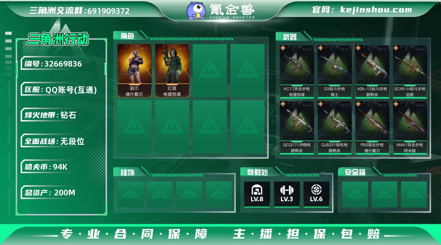 【店主推荐捡漏号!可直接换绑】200m总资产-94k哈伏币-60烽火等级-钻石-1战场等级-无军衔 【干员外观】:骇爪-维什戴尔,红狼-电锯惊魂 【近战皮肤】:近战-黑鹰 【传说外观】:M4A1突击步枪-阿米娅,ASh-12战斗步枪-鹅鸭杀,SCAR-H战斗步枪-启航,G3战斗步枪-骑士,CAR-15突击步枪-阿米娅,KC17突击步枪-电锯惊魂,QCQ171冲锋枪-鹅鸭杀,QJB201轻机枪-鹅鸭杀,R93狙击步枪-维什戴尔 【史诗外观】:腾龙突击步枪-猎鳄行动,MP5冲锋枪-战术竞备,MP5冲锋枪-竞技风,Vector冲锋枪-猎鳄行动,勇士冲锋枪-深海恐惧,勇士冲锋枪-工业狂潮 【稀有外观】:AKM突击步枪-肃杀,QBZ95-1突击步枪-公平竞技,M7战斗步枪-捣蛋鬼,SCAR-H战斗步枪-荣耀列队,腾龙突击步枪-前沿科技,腾龙突击步枪-冰天雪地,MP5冲锋枪-弄臣,MP5冲锋枪-哈夫克卫队,P90冲锋枪-黄昏,P90冲锋枪-捣蛋鬼,UZI冲锋枪-前沿科技,UZI冲锋枪-亚特兰蒂斯,SMG-45-行动开启,SMG-45冲锋枪-幻影结构,勇士冲锋枪-前沿科技,M1014霰弹枪-幻影结构,QJB201轻机枪-哈夫克卫队,SKS射手步枪-弄臣,G18-星链科技,G18-哈夫克航天 【普通外观】:PKM通用机枪-旧工业,M4A1突击步枪-高雅黑,QBZ95-1突击步枪-海浪,QBZ95-1突击...