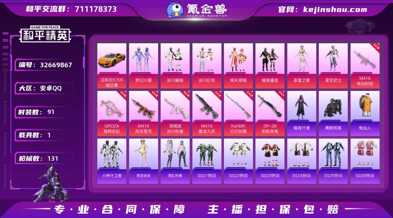 【940474】安卓 手Q-7粉装-7特效枪-1载具-4粉色飞行器-43419热力值-1王牌印记-91套装-131枪皮 【热门品类】:粉装-梦幻火箭,套装-暗夜行者,套装-龟仙人 【粉色套装】:粉装-梦幻火箭,粉装-冰川幽秘,粉装-冰川红玫,粉装-桃夭倾城,粉装-暗夜鎏金,角色-圣堂之誓,角色-星空武士 【粉色枪皮等级】:M416-风花雪月(四级),M416-电玩时刻(五级),M416-墨龙九天(三级),GROZA-旋转彩虹(五级),汤姆逊-冰川粉黛(四级),Kar98K-巳巳如意(二级),DP-28-豹影疾电(一级) 【粉色载具】:迈凯伦570S(旭日黄) 【粉色枪皮】:M416-风花雪月,M416-电玩时刻,M416-墨龙九天,GROZA-旋转彩虹,汤姆逊-冰川粉黛,Kar98K-巳巳如意,DP-28-豹影疾电 【粉色飞行器】:炫彩糖果飞行器,桃夭倾城飞行器,星空武士飞行器,龙翔九天飞行器 【粉色降落伞】:梦幻火箭降落伞,洛神天依降落伞,垂柳戏鸭降落伞,旋转彩虹降落伞,冰川粉黛降落伞,桃夭倾城降落伞,第五大道降落伞,星空武士降落伞,精灵梦叶罗丽降落伞,墨龙九天降落伞,未来领航者降落伞,异瞳寒姬降落伞,炫彩糖果降落伞 【稀有套装】:套装-龟仙人,套装-雪国风尚,套装-炫彩糖果,套装-火种守卫者,套装-青团波波,套装-霓虹热...