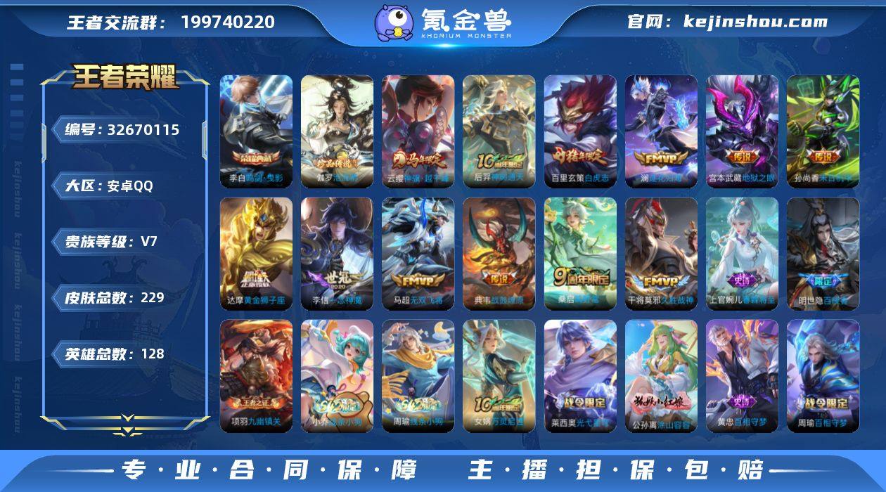 实名: 可修改 贵族等级: V7 英雄数: 128 皮肤数: 229 荣耀水晶: 鸣剑·曳影 珍品传说: 沧流箭 传说皮: 黄金狮子座,久胜战神,一念神魔,末日机甲-孙尚香,地狱之眼,无双飞将,澜逐花归海,典韦战鼓燎原,神树通天,神骥·越千峰 限定皮: 李小龙,白虎志,至尊宝,孙行者,五谷丰年,鸣野蒿