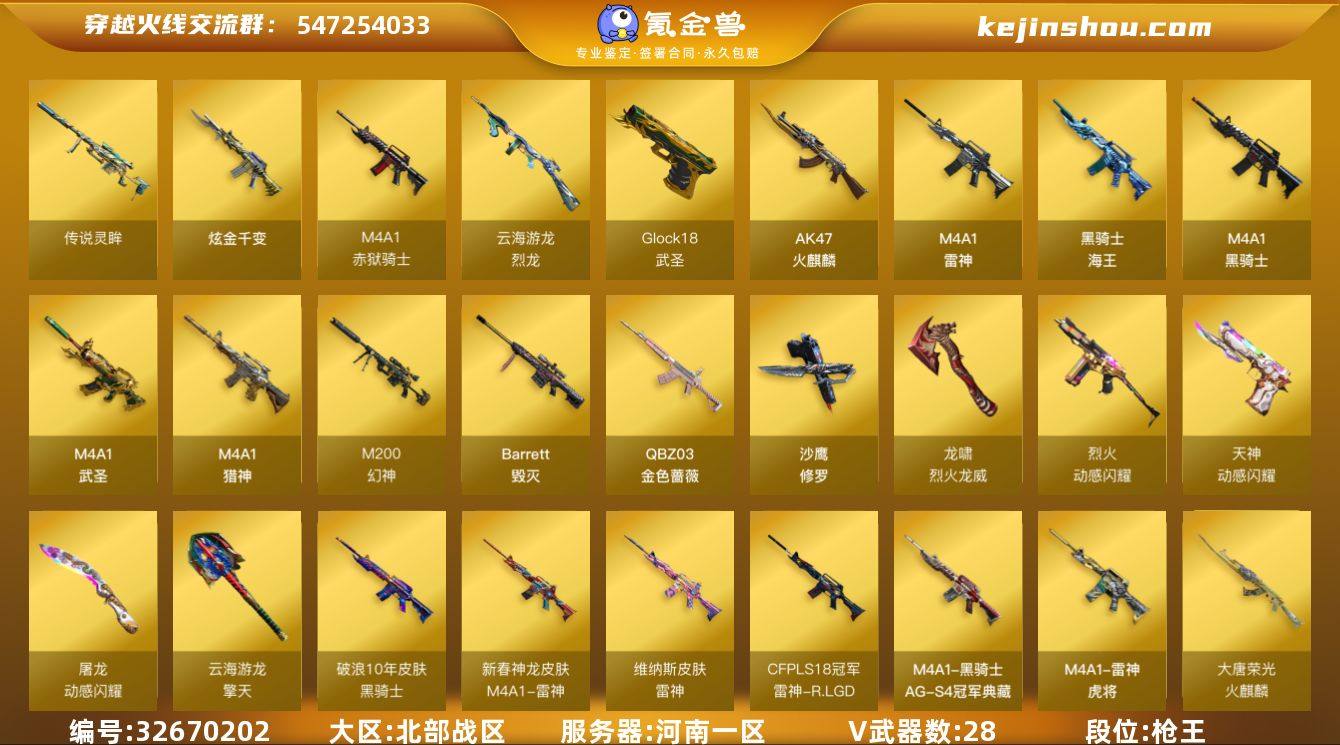 河南一区-29V-0王者武器数-1炫金武器数 【传说武器】:传说灵眸 【热门武器】:传说灵眸,QBZ03-金色蔷薇,M200-幻神,M4A1-黑骑士,羊驼玩偶,降世魔童,沙鹰-修罗*2 【王者炫金武器】:炫金千变 【音效卡】:屠龙-动感闪耀 音效卡,烈火-动感闪耀 音效卡 【皮肤】:幻神-冠军之幻,QBZ03-巅峰荣耀皮肤,雷神-虎将,雷神-R.LGD-CFPLS18冠军,雷神-维纳斯皮肤,M4A1-雷神-新春神龙皮肤,火麒麟-雷神*2,火麒麟-大唐荣光,毁灭-航天科技皮肤,毁灭-英雄计划 皮肤,黑骑士-AG-S4冠军典藏,黑骑士-破浪10年皮肤 【角色】:战地猎狐,王者炫,王者沙漠玫瑰,乔伊教练,云海玲珑,暗夜-X,初恋灵狐,电竞少女,芳心审判者,风暴女,虎妞,娟娟,葵-赛博朋克,兰-空鹰,兰-新年限定,猎狐者-追月,灵狐者-黄金海岸,龙儿,麻雀,曼陀罗-X,赛斯-X,维纳斯,雪莉杨-摸金校尉,樱-战斗天使,幽 【人偶武器】:迷你宝贝,迷你深渊冰龙,迷你波特博士,夺魂,迷你深渊冰龙-王绿豆,迷你艾比,灵狐娃娃手雷,降世魔童 【挑战大师】:试炼破坏者III 【英雄级武器】:AK47-火麒麟,M4A1-雷神,M4A1-黑骑士,M4A1-武圣,QBZ03-金色蔷薇,M4A1-猎神,烈火-动感闪耀,黑骑士-海王*2,Barrett-...
