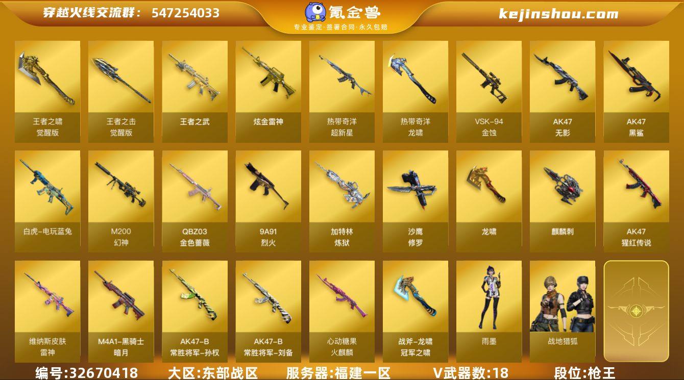 福建一区-21V-3王者武器数-1炫金武器数 【热门武器】:QBZ03-金色蔷薇,M200-幻神,白虎-电玩蓝兔,加特林-炼狱,沙鹰-修罗 【王者炫金武器】:王者之武,炫金雷神 【音效卡】:M4A1-黑骑士音效卡 【皮肤】:雷神-维纳斯皮肤,火麒麟-心动糖果,黑骑士-暗月,AK47-B-常胜将军-刘备,AK47-B-常胜将军-孙权,龙啸-冠军之啸 【角色】:雨墨,战地猎狐,奇洋探员,初恋灵狐,电竞少女,芳心审判者,风暴女,嘉年华灵狐,猎狐者-追月,灵狐者-X,龙儿,麻雀,曼陀罗-X,玫瑰花神,潘多拉-X,斯沃特-X,兔囡囡,樱-战斗天使 【人偶武器】:迷你深渊冰龙,迷你波特博士,夺魂,迷你牛牛,深渊终结者手雷,AK47-斯沃特,迷你超能女侍 【暴走生化】:超级对讲机 【挑战大师】:冰龙粉碎者-白马银枪*2,试炼破坏者III,神圣爆裂者-末日III,惩戒者III 【英雄级武器】:AK47-无影,AK47-黑鲨,超新星-热带奇洋,QBZ03-金色蔷薇,9A91-烈火,AK-47-猩红传说,白虎-电玩蓝兔,M200-幻神,VSK-94-金蚀,加特林-炼狱,沙鹰-修罗,龙啸,麒麟刺,龙啸-热带奇洋,王者之啸-觉醒版,王者之击-觉醒版,高爆手雷-云龙,闪光弹-云龙*2 【源级武器】:御·黑龙-龙太子,源·雷神,魂·雷神-诺拉,魂·雷...