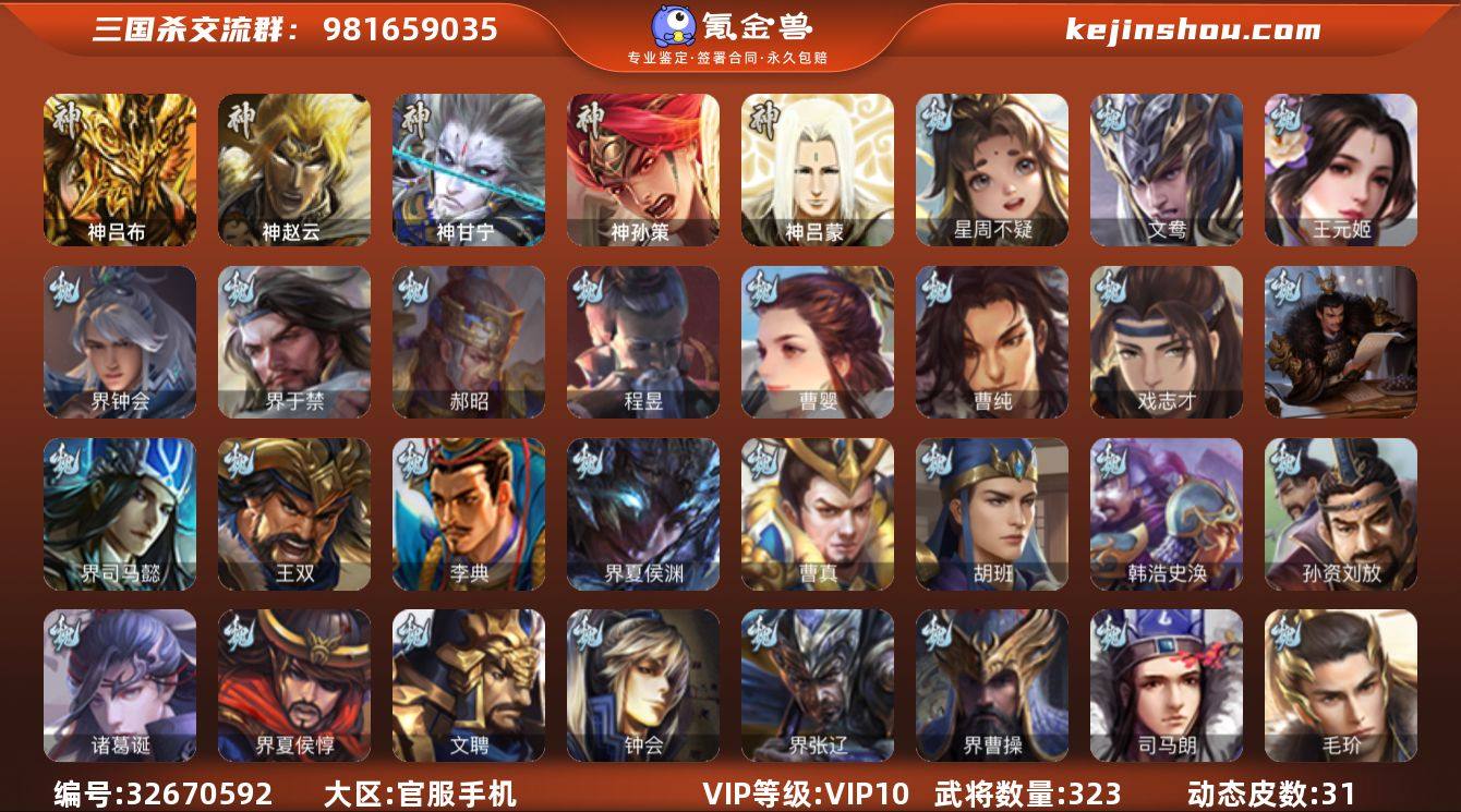 神吕布,神赵云,神甘宁,神孙策,星周不疑,王元姬,界钟会,界于禁,郝昭,曹婴,曹纯,戏志才,程昱,谋诸葛亮,谋夏侯氏,谋赵云,谋马超,诸葛瞻,张星彩,沙摩柯,谯周,花鬘,留赞,界朱然,界徐盛,文鸯,界沮授,左慈,郑玄,星黄忠,麹义,南华老仙,界李儒,谋张角,许攸,兀突骨,司马昭,神吕蒙,SP关羽,SP曹仁,SP蔡文姬,乐进,曹昂,诸葛诞,朱灵,文聘,SP姜维,钟会,曹冲,郭淮,满宠,界王异,界曹操,界司马懿,界夏侯惇,界张辽,界许褚,界郭嘉,李典,曹真,韩浩史涣,陈群,曹叡,曹休,钟繇,司马朗,李通,孙资刘放,辛宪英,吕虔,鲁芝,界荀彧,杜畿,张恭,界曹植,界满宠,界郭淮,卞夫人,华歆,蔡贞姬,袁涣,王双,崔琰,毛玠,阮慧,曹嵩,谋徐晃,牵招,胡班,界夏侯渊,唐咨,势陈到,SP孙尚香,关银屏,夏侯霸,马良,关兴张苞,廖化,界马岱,关平,简雍,刘封,界法正,界关兴张苞,界刘备,界关羽,界赵云,界马超,SP徐庶,吴懿,周仓,张松,刘谌,夏侯氏,糜竺,马忠,李严,黄皓,界黄月英,赵统赵广,严颜,界伊籍,界庞统,界祝融,张翼,杨仪,邓芝,费祎,糜夫人,界周...