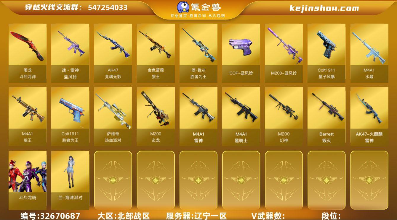 T194116cf北部/辽宁一区/13V/幻神/雷神/黑骑士/毁灭/巴雷特金色蔷薇/屠龙/金色蔷薇狼王/3音效卡2皮