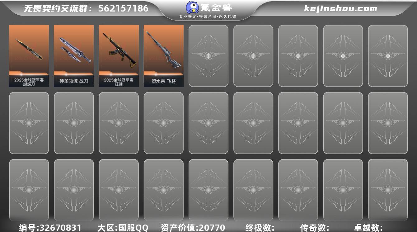 XSQY52【英雄28-皮肤45-皮肤价值20770 2025全球冠军赛套装】【游戏等级】Lv173 【段位】 未定级 【R点】590 【皮肤总价值】20,770 【英雄数量】28 【皮肤数量】45 【挂饰数量】70 【卡面数量】98 【喷漆数量】86 【狂怒】狂怒-蒙太奇 狂怒-神圣领域 【鬼魅】鬼魅-宿怨 鬼魅-幻心猎手 鬼魅-诡秘蛇影 鬼魅-星云暗涌 【幻影】幻影-般若假面 幻影-末日之翼 幻影-神圣领域 【正义】正义-游戏结束 正义-日耀风暴 正义-西部未来 正义-月球哨兵 正义-纳米打击 【狂徒】狂徒-2025全球冠军赛 狂徒-虚空遗器 狂徒-诡秘蛇影 狂徒-掠影 狂徒-盖亚的复仇 狂徒-洪荒怒焰 【近战武器】近战武器-2025全球冠军赛蝴蝶刀 近战武器-诡秘蛇影军刀 近战武器-神圣领域战刀 近战武器-RGX11zPro//3.0爪刀 【标配】标配-星际猎兵 标配-阿特拉斯指挥部 标配-VCT25xEDG 标配-折光棱晶 【骇灵】骇灵-无限竞技 骇灵-星云暗涌 【莽侠】莽侠-诡秘蛇影 莽侠-月球哨兵 【奥丁】奥丁-末日之翼 【戍卫】戍卫-折光棱晶 戍卫-月球哨兵 【飞将】飞将-末日之翼 飞将-塑水宗 【蜂刺】蜂刺-折光棱晶 蜂刺-星云暗涌 【判官】判官-诡秘蛇影 【短炮】短炮-末日之翼 【冥驹】冥驹-星云暗涌 【獠犬】獠犬-神圣领域 【战神】战...