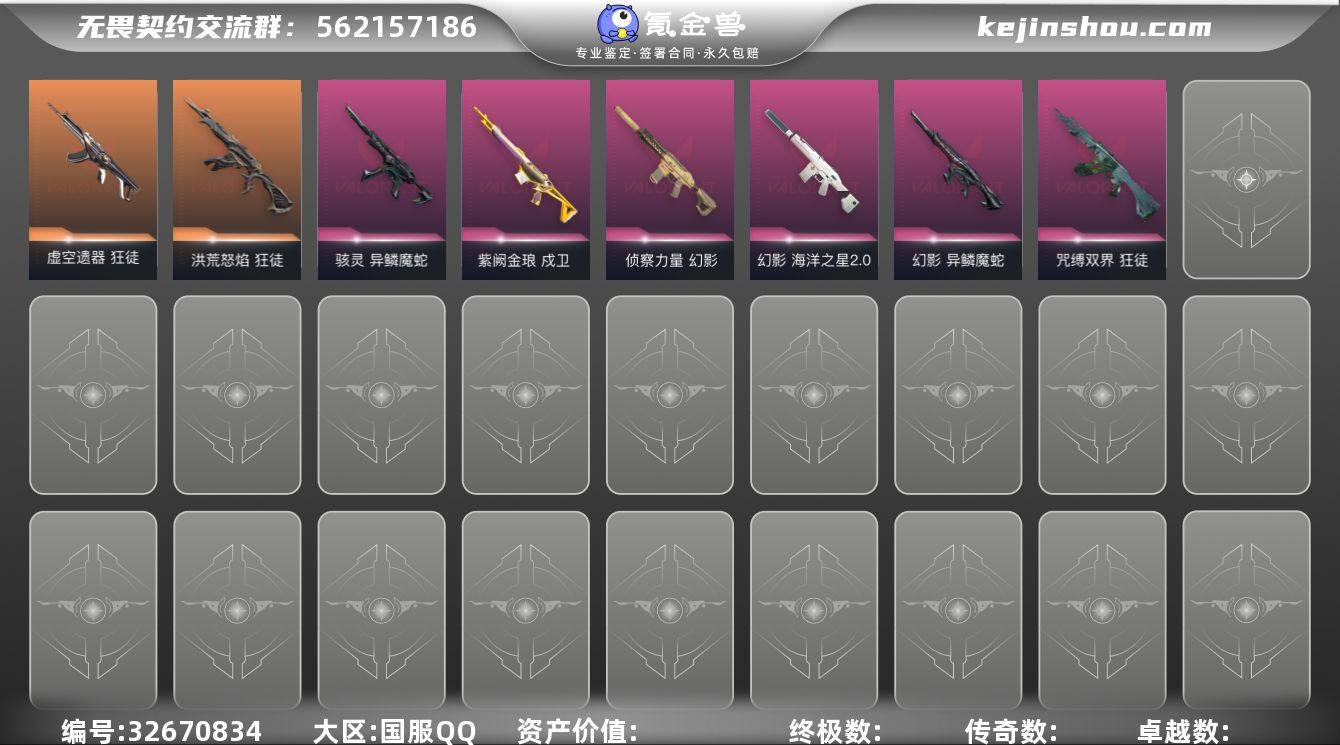 【无畏契约】等级:104,已用无畏点21060,已用源晶点570,橙皮:狂徒-洪荒怒焰|狂徒-奇点2.0|近战-生物分子解离器|标配-VCT25 x JDG|近战-双生獠牙|狂徒-虚空遗器|近战-诡秘蛇影 军刀|近战-阿特拉斯指挥部 甩棍__紫皮:幻影-侦察力量|戍卫-紫阙金琅|骇灵-异鳞魔蛇|幻影-异鳞魔蛇|幻影-海洋之星2.0|狂徒-咒缚双界__段位:未定级__蓝皮:鬼魅-星云暗涌|蜂刺-折光棱晶|戍卫-折光棱晶|标配-折光棱晶|飞将-末日之翼|幻影-末日之翼|短炮-末日之翼|奥丁-末日之翼|正义-太空穿梭|战神-太空穿梭|判官-太空穿梭|戍卫-太空穿梭|骇灵-阿特拉斯指挥部|莽侠-阿特拉斯指挥部|标配-阿特拉斯指挥部|狂徒-阿特拉斯指挥部__绿皮:判官-诡秘蛇影|鬼魅-诡秘蛇影|莽侠-诡秘蛇影|狂徒-诡秘蛇影|短炮-悠闲猫生|飞将-悠闲猫生|幻影-悠闲猫生|獠犬-悠闲猫生|标配-星际猎兵|鬼魅-幻心猎手__英雄:尚勃勒|维斯|黑梦|斯凯|暮蝶|霓虹|壹决|星礈|K/O|幽影|夜露|钢锁|奇乐|炼狱|铁臂|贤者|猎枭|钛狐|芮娜|零|捷风|不死鸟|幻棱|雷兹|禁灭