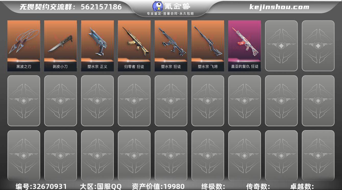 XSQY50【黑波之刃 2022全球冠军赛套装】【游戏等级】Lv108 【段位】 未定级 【R点】385 【皮肤总价值】19,980 【英雄数量】18 【皮肤数量】13 【挂饰数量】47 【卡面数量】58 【喷漆数量】39 【鬼魅】鬼魅-幻心猎手 【狂徒】狂徒-归零者 狂徒-塑水宗 狂徒-盖亚的复仇 【正义】正义-日耀风暴 正义-游戏结束 正义-塑水宗 正义-纳米打击 【幻影】幻影-2022全球冠军赛 【近战武器】近战武器-2022全球冠军赛蝴蝶刀 近战武器-剥皮小刀 近战武器-黑波之刃 【飞将】飞将-塑水宗