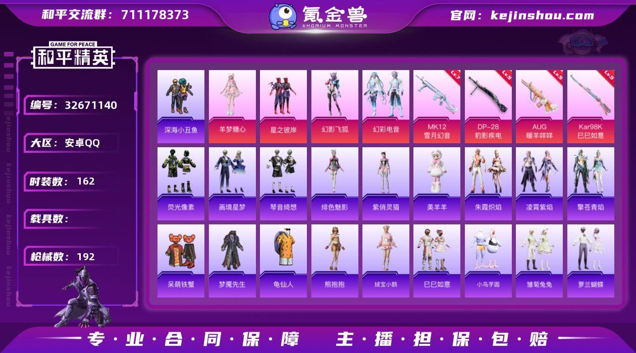 安卓 手Q-5粉装-4特效枪-0载具-2粉色飞行器-56561热力值-11王牌印记-162套装-192枪皮 【热门品类】:套装-深海小丑鱼,套装-龟仙人 【粉色套装】:粉装-星之彼岸,粉装-幻影飞狐,粉装-幻彩电音,角色-羊梦糖心,角色-霁蓝缠春 【粉色枪皮等级】:AUG-暖羊咩咩(五级),Kar98K-巳巳如意(五级),MK12-雪月幻音(七级),DP-28-豹影疾电(五级) 【粉色枪皮】:AUG-暖羊咩咩,Kar98K-巳巳如意,MK12-雪月幻音,DP-28-豹影疾电 【粉色飞行器】:炫彩糖果飞行器,极意拳锋飞行器 【粉色降落伞】:忍者神龟降落伞,月影灵韵降落伞,星穹咏叹调降落伞,冷漠罗丽降落伞,绯穹魔姬降落伞,喜羊羊与灰太狼降落伞,异瞳寒姬降落伞,炫彩糖果降落伞,霁蓝缠春降落伞 【稀有套装】:套装-龟仙人,套装-熊抱抱,套装-绒宝小鹅,套装-巳巳如意,套装-小鸟芋圆,套装-荧光像素,套装-雪国风尚,套装-炫彩糖果,套装-雏菊兔兔,套装-萝兰蝴蝶,套装-小熊娃娃,套装-糖糖葫芦,套装-青团波波,套装-棉花软糖,角色-都市丽猫,角色-摩登魅猫,套装-燕燕于飞,套装-鱼渊荷华,套装-粉恋花,套装-紫幽梦,套装-蓝冰羽,套装-星影赞美诗,套装-极速光影,套装-彩虹兔,套装-云朵鹅,套装-雪绒豹,角色-时...