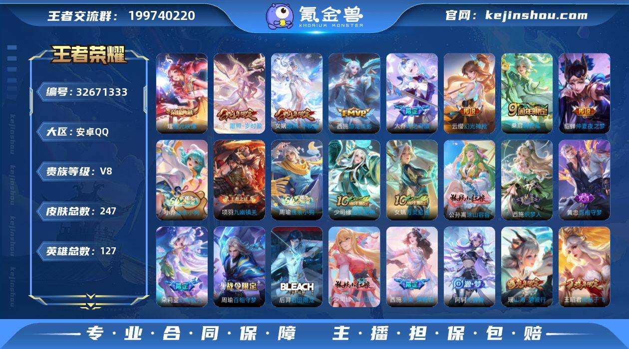 实名: 可修改 性别: 女号 贵族等级: V8 英雄数: 127 皮肤数: 247 荣耀水晶: 拾光映像 传说皮: 仲夏夜之梦,游龙清影,大乔-时之奇旅,幻光神枪 限定皮: 遇见飞天,李小龙,游园惊梦,梁祝,奇迹圣诞,凤凰于飞,五谷丰年,山海·碧波行,至美·乘鲤谣,鸣野蒿,愿照·千秋盛,愿照·岁时盈
