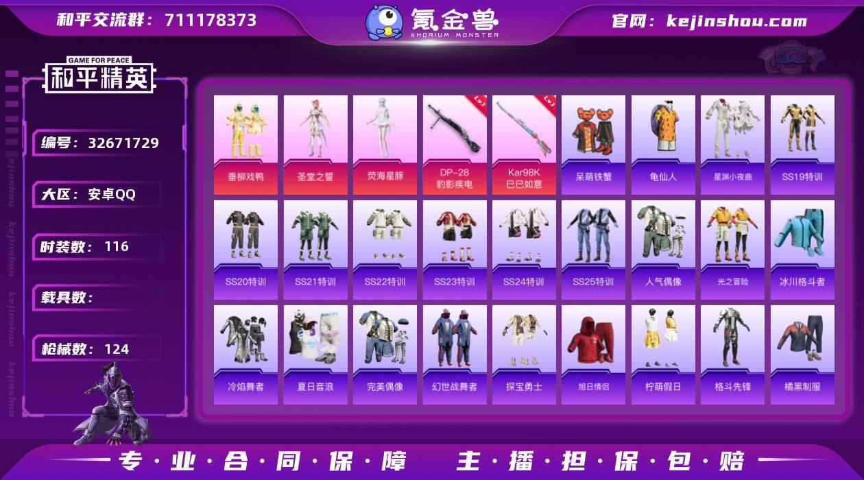 TD2632411安卓 手Q-3粉装-2特效枪-0载具-1粉色飞行器-36395热力值-7王牌印记-116套装-124枪皮 【热门品类】:套装-龟仙人 【粉色套装】:粉装-垂柳戏鸭,角色-圣堂之誓,角色-荧海星豚 【粉色枪皮等级】:Kar98K-巳巳如意(一级),DP-28-豹影疾电(一级) 【粉色枪皮】:Kar98K-巳巳如意,DP-28-豹影疾电 【粉色飞行器】:炫彩糖果飞行器 【粉色降落伞】:橘柚倾心降落伞,环太平洋降落伞,垂柳戏鸭降落伞,太空嘟嘟降落伞,旋转彩虹降落伞,未来歌姬降落伞,炫彩糖果降落伞 【稀有套装】:套装-龟仙人,套装-炫彩糖果,套装-星渊小夜曲 【稀有枪皮】:AUG-冰晶雪宝,AKM-奇异狩猎者,AKM-彩虹符号,AKM-生命誓言,AKM-破晓战魂,AKM-龙的传人,M16A4-幻世战舞者,M16A4-甜心亚梦,M16A4-蓝色火焰,SCAR-L-夜灯,SCAR-L-炫彩节奏,SCAR-L-玉兔迎春,SCAR-L-红色方程式,SCAR-L-银河战甲,M416-糯团青竹,M416-红色方程式,M416-绯红前夜,M416-蓝色火焰,GROZA-彩虹符号,GROZA-懵萌河马,GROZA-田园牧歌,AUG-天降萌叽,QBZ-彩虹符号,M762-天降萌叽,M762-彩虹符号,M762-暗夜鎏金,M762-甜心宝贝,Mk47-妙红点点,G36C-懵萌河马,AC-VAL-天降萌叽,AC-VAL-甜心亚梦,蜜獾-垂柳...