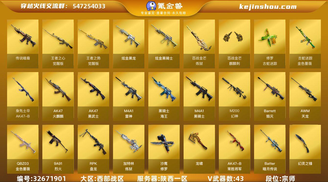 陕西一区-47V-2王者武器数-2炫金武器数 【传说武器】:传说暗裔 【热门武器】:传说暗裔,QBZ03-金色蔷薇,M200-幻神,金色蔷薇-古蛇迷踪,修罗-古蛇迷踪,牛牛-AK47,M4A1-黑骑士,RPK-盘龙*3,加特林-炼狱,COP-白鲨,沙鹰-修罗 【王者炫金武器】:炫金骑士,炫金黑龙 【音效卡】:M4A1-黑骑士音效卡,炼狱-百战金芒-庆典舞曲音效卡 【皮肤】:雷神-暗月,雷神-化蛇 皮肤,M4A1-再燃火线,雷神-神秘按键 皮肤,火麒麟-平天大圣*3,火麒麟-巅峰荣耀,毁灭-冠军之怒,毁灭-黑大圣皮肤,毁灭-风暴,毁灭-魔灵皮肤,战神-粉色甜心皮肤,战神-紫绶金章皮肤,AK47-B-常胜将军-曹操*2,AK47-B-常胜将军-刘备,AK47-B-常胜将军-孙权*3,修罗-冠军之魂,轻型军用手斧-再燃火线,擎天-冠军之击,麒麟刺-荣耀世冠白鲨 【角色】:葵,王者-零-国色天香,王者葵-惊若翩鸿,蛇隐宗,修道士,葵-阿尔法武装,幻面灵狐,暗夜-X,初恋灵狐,风暴女,虎妞,娟娟,灵狐者-X,灵狐者-黄金海岸,龙儿,龙儿-小淘气,麻雀,曼陀罗-X,玫瑰花神,潘多拉-X,潘多拉-甜心教官,青霞仙子,蛇姬,蜀雪,维纳斯,新娜塔莎,雪莉杨,樱-战斗天使,影武者-X,智影 【人偶武器】:COP-白鲨,牛牛-AK47,迷你...