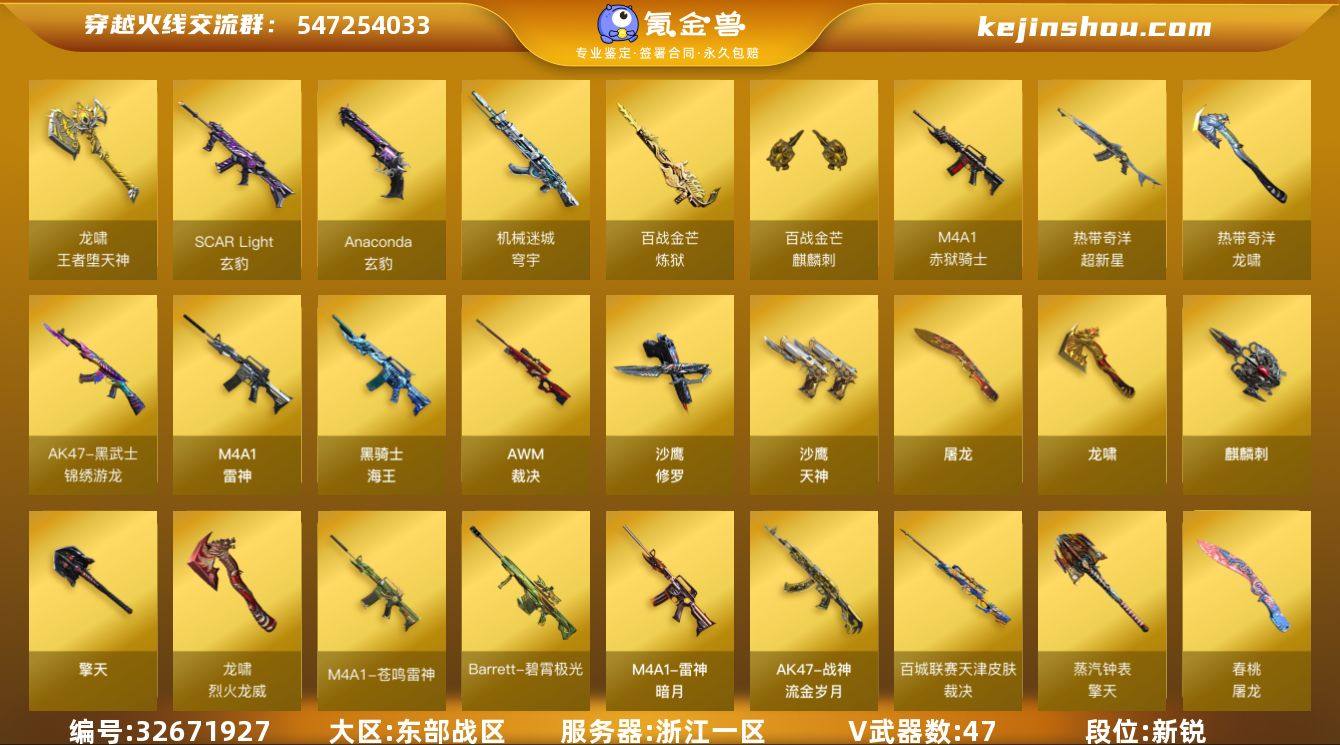 浙江一区-47V-3王者武器数-0炫金武器数 【传说角色】:传说影煞 【热门武器】:沙鹰-修罗,黄金猫猫手套 【王者炫金武器】:王者凌虎,龙啸-王者堕天神,王者冰锋 【音效卡】:擎天-云海游龙音效卡,AWM-裁决音效卡,炼狱-百战金芒-庆典舞曲音效卡 【皮肤】:AWM-裁决-百城联赛天津皮肤,裁决-运输船 皮肤,雷神-暗月,M4A1-再燃火线,战神-流金岁月皮肤,屠龙-春桃 皮肤,轻型军用手斧-再燃火线,龙啸-青青莓果 皮肤,龙啸-紫凛 皮肤,擎天-蒸汽钟表 皮肤,麒麟刺-甜蜜糖果 皮肤 【角色】:零·纪元,战地猎狐,奇洋探员,葵-阿尔法武装,暗夜-X,初恋灵狐,飞虎队-X,虎妞,零-水下丽影,灵狐者-X,斯沃特-X,兔囡囡,维纳斯,夜玫瑰-宠粉,游珑儿,潘多拉-N,团团 【人偶武器】:迷你深渊冰龙*2,迷你裂空之翼,迷你曼提柯尔,夺魂,生化手雷-机甲核心*2,迷你巨石泰坦-魔花研究所 【挑战大师】:试炼破坏者III,KAC-圣炎切割者III,神圣爆裂者-末日III,封神放逐者III 【英雄级武器】:M4A1-雷神,黑武士-锦绣游龙,超新星-热带奇洋,SCAR Light-玄豹,黑骑士-海王,机械迷城-穹宇,AWM-裁决,炼狱-百战金芒,沙鹰-修罗,沙鹰-天神,Anaconda-玄豹,屠龙,龙啸*3,擎天,麒...