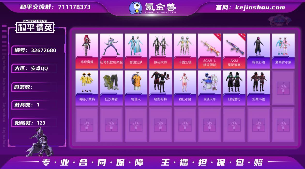 XS11469【1载具-5粉装-3特效枪 雪国 紫螳螂 狂沙舞者,暗影哥特,激萌罗小黑,浪漫天命 猫包】安卓手Q-1载具-5粉装-3特效枪-86套装-123枪皮-3王牌印记-不朽星钻Ⅴ-41953热力值【1载具】玛莎拉蒂Quattroporte(夜幕蓝)【5粉装】角色-初号机款机体服,角色-绯穹魔姬,数码大师,雪国幻梦,千面幻镜【3特效枪】AKM-星际浪客[6级],SCAR-L-桃夭倾城[7级],DP-28-豹影疾电[4级]【5稀有】狂沙舞者,暗影哥特,激萌罗小黑,浪漫天命,AKM-百万伏特【2飞行器】光之冒险尾迹,千面幻镜飞行器【3头盔】雪国精灵头盔,百万伏特头盔,深海小丑鱼头盔【4背包】百万伏特背包,雪国精灵背包,深海小丑鱼背包,深海曼妙背包【196其它衣服和枪皮】霓虹街区,音速流光,角色-绛羽幽主,战术大师,田园牧歌,龙腾端午,雪绒豹,焰鹰斗篷,SS18特训,娇憨猪猪,SS37特训,北国孤狼,SS19特训,海盐绵绵冰,SS33特训,角色-薰款战斗服,沙漠兵团,WiFi精灵,黄色运动,核芯基因,人气偶像,长空猛禽,SS7特训,黑色伏地魔,SS12特训,梦幻奶油,缤纷果语,跃动心情,SS11特训,龟仙人,霓虹极客,牛气满满,冷焰舞者,怒火燎原,夏日音浪,SS22特训,吉莉礼服,角色-零款战斗服,光之冒险,SS25特训,竞技勇士朋克,SS34特训,暗夜行者,电音精灵,热情海星,萌趣咩咩,...