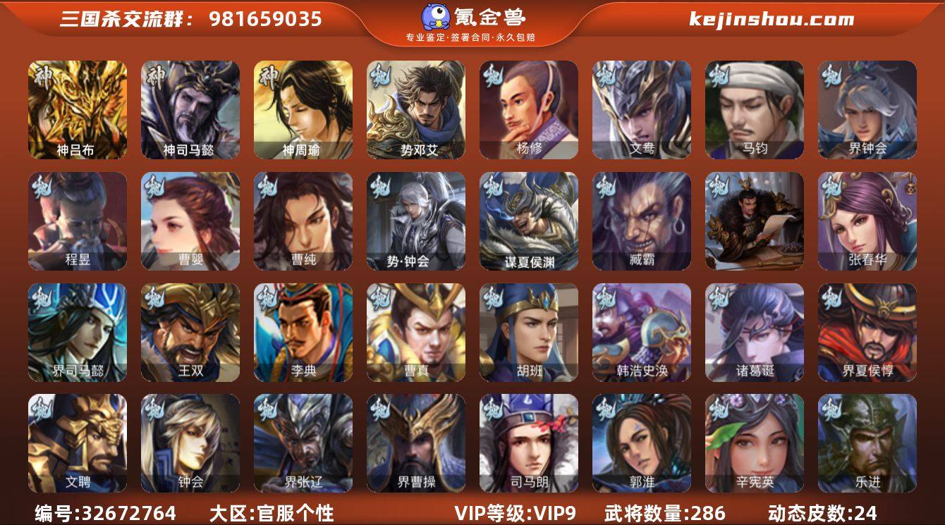 【14789781】官阶:骠骑将军;VIP等级:VIP9;史诗武将数量:23;动态皮肤数量:24;武将总数:286;史诗宝珠数量:17;将魂数量:6655;神将:2;魏国史诗武将:14;蜀国史诗武将:3;吴国史诗武将:4;群史诗武将:7