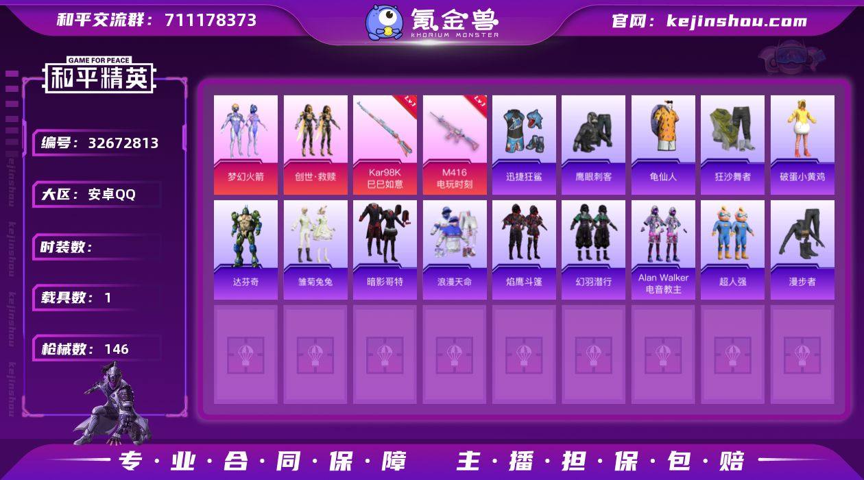 XS11463【梦幻火箭 红眼罩 浪漫天命】安卓手Q-1载具-2粉装-2特效枪-127套装-146枪皮-10王牌印记-英勇黄金Ⅱ-42079热力值【1载具】路特斯EVIJA(星际黄)【2粉装】创世·救赎,梦幻火箭【2特效枪】M416-电玩时刻[5级],Kar98K-巳巳如意[5级]【3稀有】暗影哥特,浪漫天命,狂沙舞者【3飞行器】顶峰精英尾迹,空岛之星尾迹,粉色滑翔尾迹【1头盔】梦幻火箭头盔【1背包】梦幻火箭背包【266其它衣服和枪皮】极速竞梦,黄色运动,老实芭蕉,玉兔迎春,角色-Mark.06,极速红龙,荷畔雨呱,人气偶像,黑色伏地魔,街头潮人,幻羽潜行,青春校园,长空猛禽,橘黑制服,SS22特训,SS25特训,虎虎生威吉莉,SS24特训,白糯汤圆,焰鹰斗篷,音速流光,猛禽,蓝彩潮人,铁血战翼,蝶变,SS29特训,霓虹街区,甜心亚梦,幽夜迷踪,SS23特训,萌黄之夏,荣耀,柠萌假日,轻风白浪,角色-达芬奇,SS28特训,蓝色运动,竞技名士,深蓝色名流,绮丽涂鸦,白色伏地魔,冰川特警,牛气冲天,巳巳如意,青涩时光,SS20特训,萝兰蝴蝶,SS31特训,SS19特训,魅力单车,灼焰舞者,活力之心,福星高照,热情海星,萌趣咩咩,青玉碎影,漫步者,王牌教练,龙的传人,红色运动,空岛之星,夏日音浪,沙漠兵团,SS27特训,飞驰魅影,雏菊兔兔,滨海假日,虚音幻奏,猎鹰,Alan Walker,迅捷...