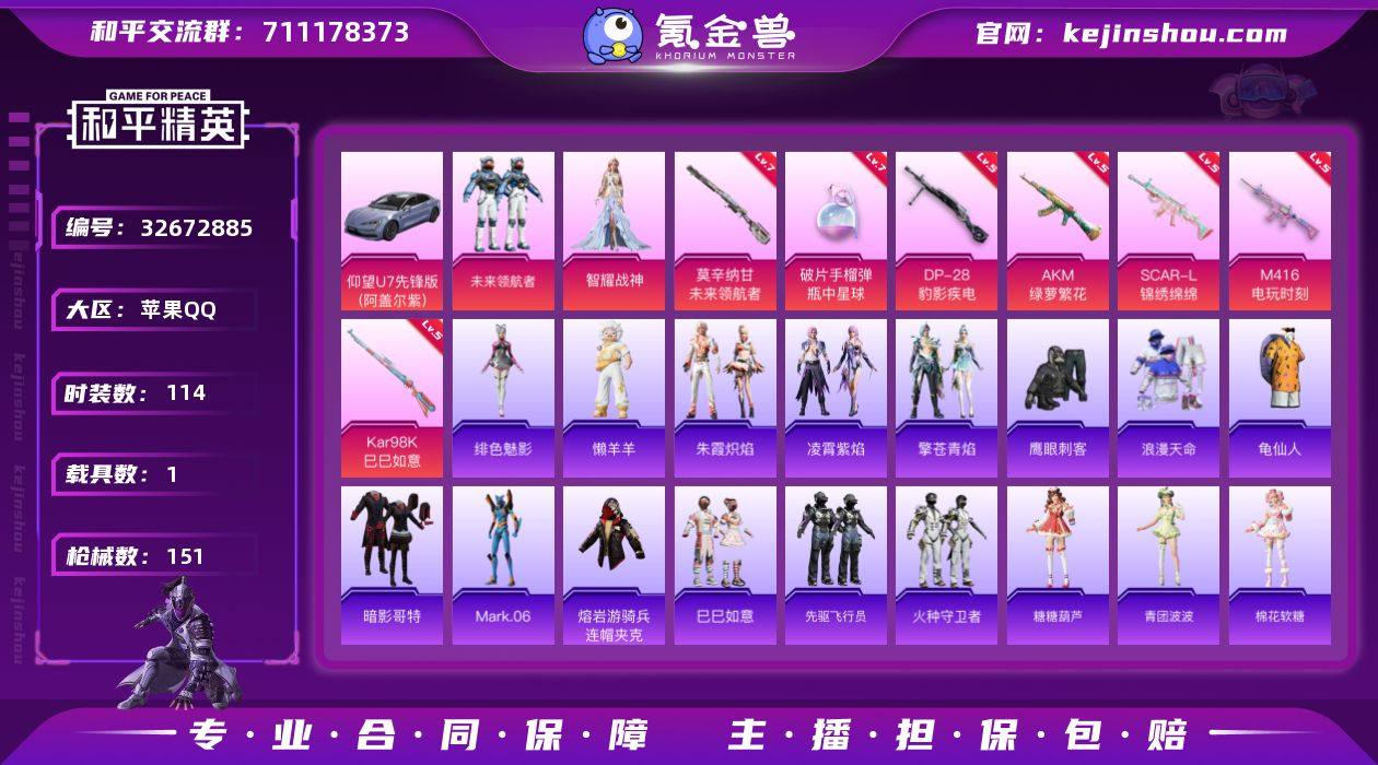苹果 手Q-2粉装-7特效枪-1载具-1粉色飞行器-44028热力值-14王牌印记-114套装-151枪皮 【热门品类】:套装-浪漫天命,套装-龟仙人,套装-暗影哥特,角色-Mark.06,熔岩游骑兵连帽夹克 【粉色套装】:粉装-未来领航者,角色-智耀战神 【粉色枪皮等级】:AKM-绿萝繁花(五级),SCAR-L-锦绣绵绵(五级),M416-电玩时刻(五级),Kar98K-巳巳如意(五级),莫辛纳甘-未来领航者(七级),DP-28-豹影疾电(五级),破片手榴弹-瓶中星球(七级) 【粉色载具】:仰望U7(阿盖尔紫) 【粉色枪皮】:AKM-绿萝繁花,SCAR-L-锦绣绵绵,M416-电玩时刻,Kar98K-巳巳如意,莫辛纳甘-未来领航者,DP-28-豹影疾电,破片手榴弹-瓶中星球 【粉色降落伞】:飒粉甜心降落伞,莲影清波降落伞,未来领航者降落伞,千金淑猫降落伞,圣斗士星矢降落伞,冷漠罗丽降落伞,宁雨蝶降落伞,喜羊羊与灰太狼降落伞,魔童闹海 哪吒降落伞 【稀有套装】:套装-龟仙人,套装-巳巳如意,套装-先驱飞行员,套装-火种守卫者,套装-糖糖葫芦,套装-青团波波,套装-棉花软糖,角色-都市丽猫,套装-燕燕于飞,套装-鱼渊荷华,套装-粉恋花,套装-紫幽梦,套装-蓝冰羽,套装-极速光影,套装-云朵鹅,套装-雪绒豹,套装-蜜露汐语,套装-...