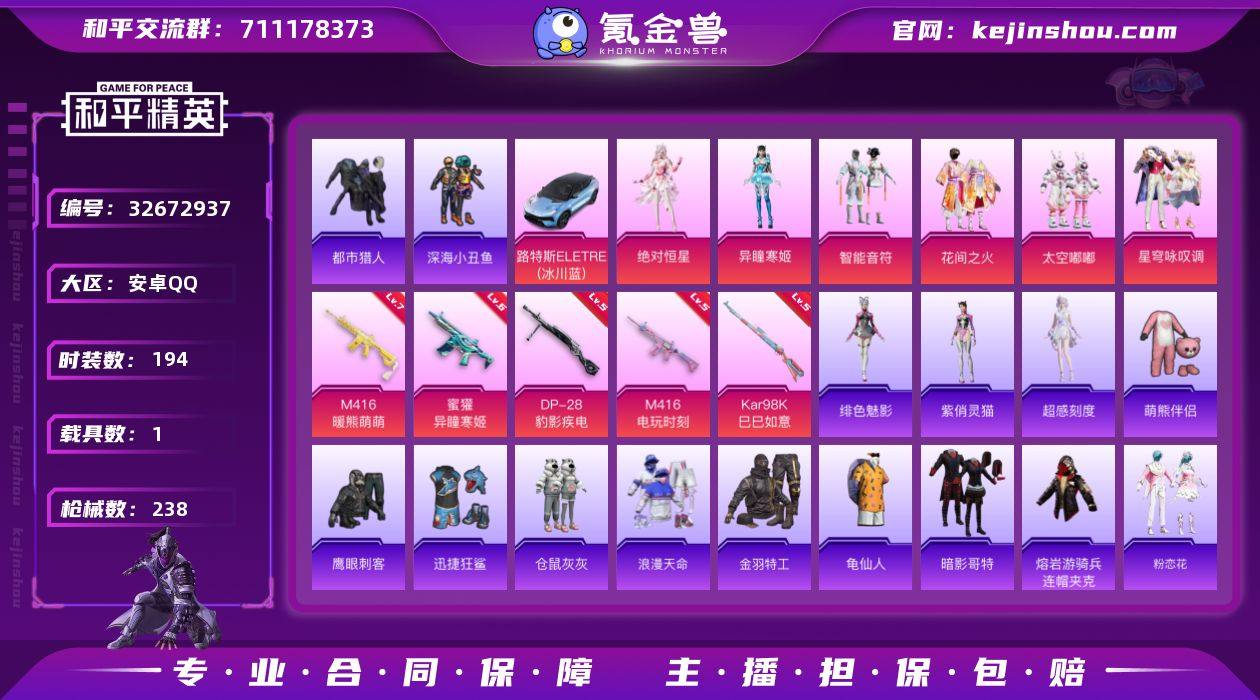 安卓 手Q-6粉装-5特效枪-1载具-2粉色飞行器-75418热力值-13王牌印记-194套装-238枪皮 【热门品类】:套装-浪漫天命,套装-都市猎人,套装-深海小丑鱼,套装-金羽特工,套装-龟仙人,套装-暗影哥特,套装-萌熊伴侣,熔岩游骑兵连帽夹克 【粉色套装】:角色-绝对恒星,粉装-智能音符,粉装-花间之火,粉装-太空嘟嘟,粉装-星穹咏叹调,角色-异瞳寒姬 【粉色枪皮等级】:M416-暖熊萌萌(七级),M416-电玩时刻(五级),蜜獾-异瞳寒姬(六级),Kar98K-巳巳如意(五级),DP-28-豹影疾电(五级) 【粉色载具】:路特斯ELETRE(冰川蓝) 【粉色枪皮】:M416-暖熊萌萌,M416-电玩时刻,蜜獾-异瞳寒姬,Kar98K-巳巳如意,DP-28-豹影疾电 【粉色飞行器】:梦幻火箭飞行器 【粉色降落伞】:绝对恒星降落伞,暖熊萌萌降落伞,垂柳戏鸭降落伞,镜光幻境降落伞,幻彩电音降落伞,异瞳寒姬降落伞 【稀有套装】:套装-龟仙人,角色-超感刻度,套装-雪国风尚,套装-粉恋花,套装-紫幽梦,套装-蓝冰羽,套装-星渊小夜曲,套装-霓虹热舞,套装-云朵鹅,套装-雪绒豹,角色-灵公主,角色-绯色魅影,角色-紫俏灵猫,套装-炫彩糖果 【稀有枪皮】:AUG-冰晶雪宝,AKM-彩虹符号,AKM-影袭,AKM-灼热熔岩,AKM-...