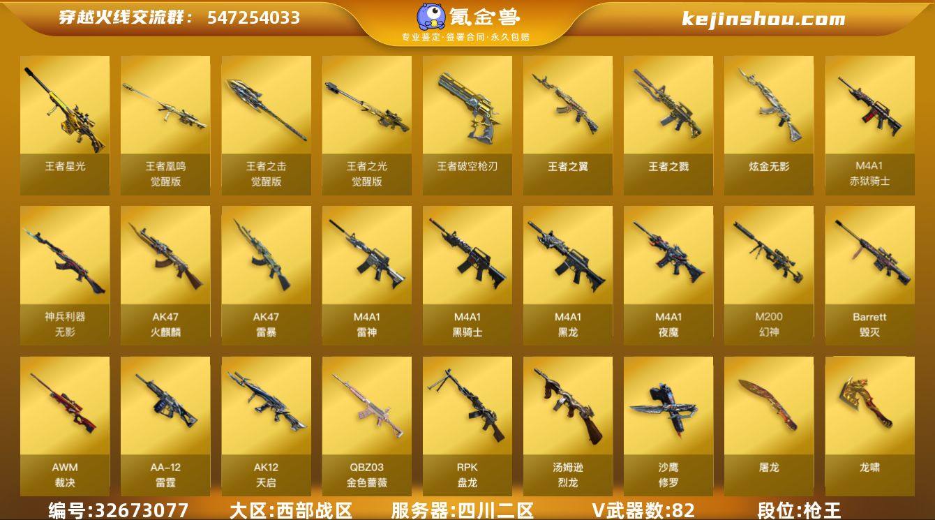四川二区-84V-7王者-1炫金 【热门武器】:G36C-幻影,QBZ03-金色蔷薇,M200-幻神,C.A.T,M4A1-黑骑士,汤姆逊-烈龙,RPK-盘龙,斯泰尔-蝴蝶,USP-雷暴*3,沙鹰-修罗*2 【王者炫金武器】:王者之戮,王者之翼,王者星光,王者破空枪刃,炫金无影 【音效卡】:AK47-火麒麟音效卡,M4A1-雷神音效卡,M4A1-黑骑士音效卡,Barrett-毁灭音效卡 【皮肤】:裁决-胜者为王 皮肤,雷神-荣耀之魄,火麒麟-华夏之心,火麒麟-心动糖果,毁灭-星空,黑龙-能量核心,无影耀金皮肤,战神-粉色甜心皮肤*3,战神-紫绶金章皮肤*9,战神-流金岁月皮肤*8,天龙-能量核心,极光-能量核心,修罗-能量核心 【角色】:樱,隼,乔伊教练,暗夜-X,芳心审判者,嘉年华灵狐,兰-新年限定,灵狐者-X,灵狐者-黄金海岸,龙儿,潘多拉-X,潘多拉-甜心教官,潜龙队-X,青霞仙子,蛇姬,斯沃特-X,蜀雪,新娜塔莎,雪莉杨,影武者-X,游珑儿 【人偶武器】:M4A1-雷神-精英刀锋,迷你宝贝,斯泰尔-蝴蝶,AWM-灵狐-15周年嘉年华,M37-葵,COP-旗袍,C.A.T,迷你裂空之翼,夺魂,闪光弹-小乔 【暴走生化】:超级对讲机 【挑战大师】:神圣爆裂者III,AK47-冰龙粉碎者*2,激光毁灭者III-白马银枪,VEPR-12-金魔 【...